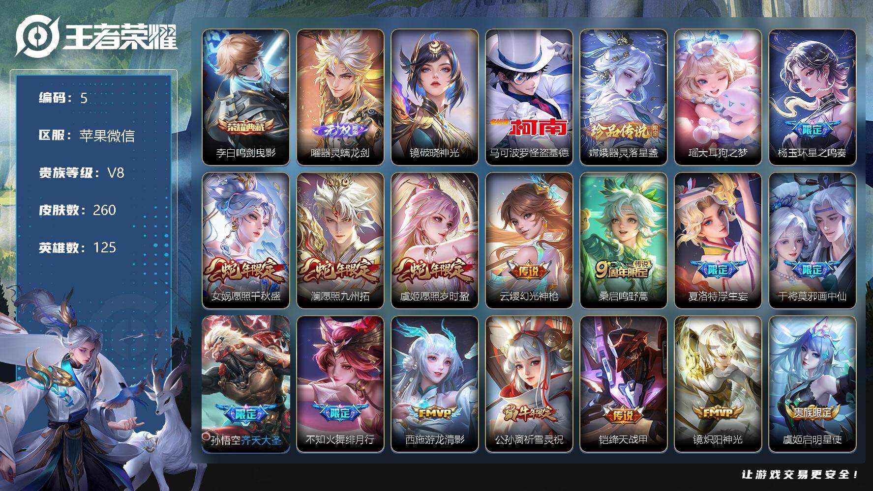 - [12280556]V8 1典藏 15传说 125英雄 302皮肤 典藏英雄武则天 可修改实名 优质装备:赤影疾锋,黄金狮子座,黄金射手座,一念神魔,末日机甲-孙尚香(绿蚂蚱),地狱火,海洋之心,地狱之眼,李逍遥,超时空战士-狄仁杰 珍宝阁皮:妄想食味,蔷薇恋人 限定皮:愿照·千秋盛(女娲年限),鸣野蒿,至尊宝,凤求凰(白切鸡),飞衡(韩信年限),遇见飞天,五谷丰年,冰锋战神,武圣,游园惊梦,梁祝,龙胆,李小龙,大圣娶亲,引擎之心,天魔缭乱 史诗皮:器灵·浮梦炉,怒海争锋,蒙犽顽岩魄,蔬乡物语(鲁班七号),紫霞仙子,白龙吟,黄金分割率,特工魅影,千年之狐,江河有灵,冰冠公主,偶像歌手,暗夜猫娘,龙骑士(小龙虾),末日机甲-吕布,猫狗日记-孙策,猫狗日记-大乔,乱世虎臣,节奏热浪,女仆咖啡,摇滚巨星,水果甜心,绅士熊喵,天才门将,星夜王子,心灵骇客,功夫厨神,德古拉伯爵,暗隐猎兽者,幽灵船长,鬼剑武藏,心灵战警,乐园奇幻夜,舞动绿茵,地狱岩魂,诗语江南,纤云弄巧,繁星吟游(呼啦呼啦),拒霜思,缤纷独角兽,乘风破浪,逐浪之夏,水晶猎龙者,曙光守护者,箭羽风息,金属风暴,原初追逐者,圣诞狂欢,圣诞恋歌,鹰眼统帅,暗夜贵公子,魅力维加斯,未来纪元-赵云