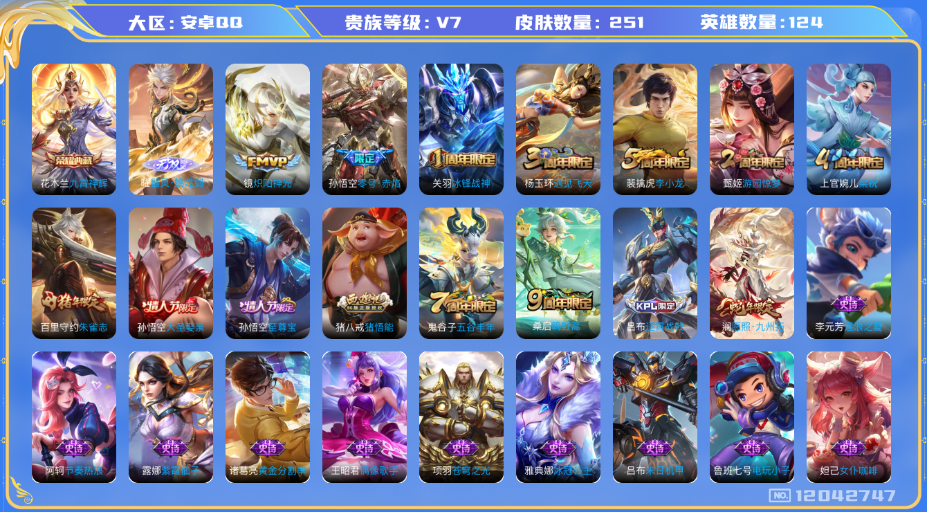 [12042747]【特价急出/详情看图】:安卓Q-V7-最强王者段位-124英雄-251皮肤-1典藏-1无双-5传说-69史诗