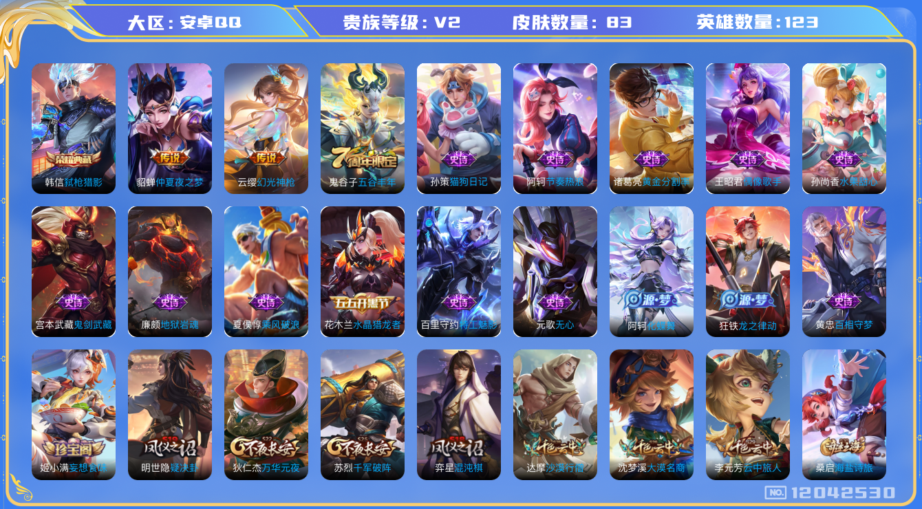 [12042530]【特价急出/详情看图】:安卓Q-V2-最强王者段位-123英雄-83皮肤-1典藏-2传说-16史诗