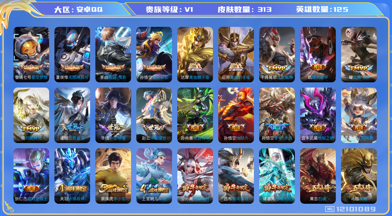 - PX_2102287-实名: 可修改 贵族等级: V4 英雄数: 98 皮肤数: 64 限定皮: 梁祝,至美·乘鲤谣,鸣野蒿