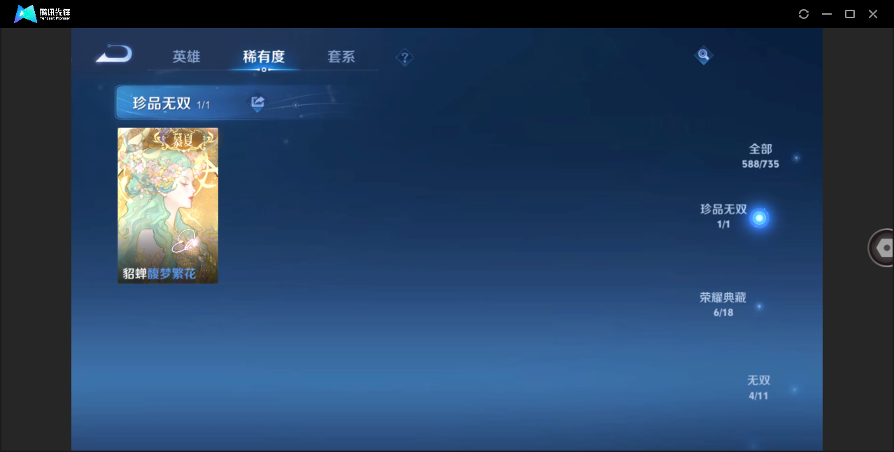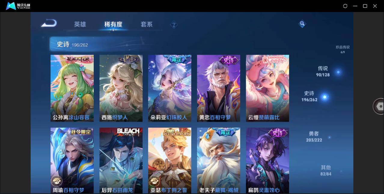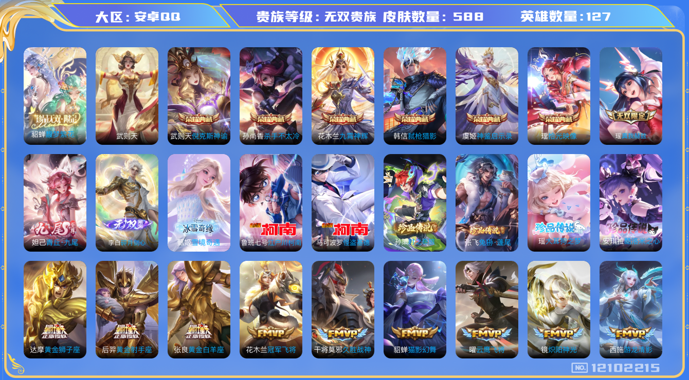 - PX_2091300-贵族等级: V2 英雄数: 62 皮肤数: 30 限定皮: 至尊宝,五谷丰年