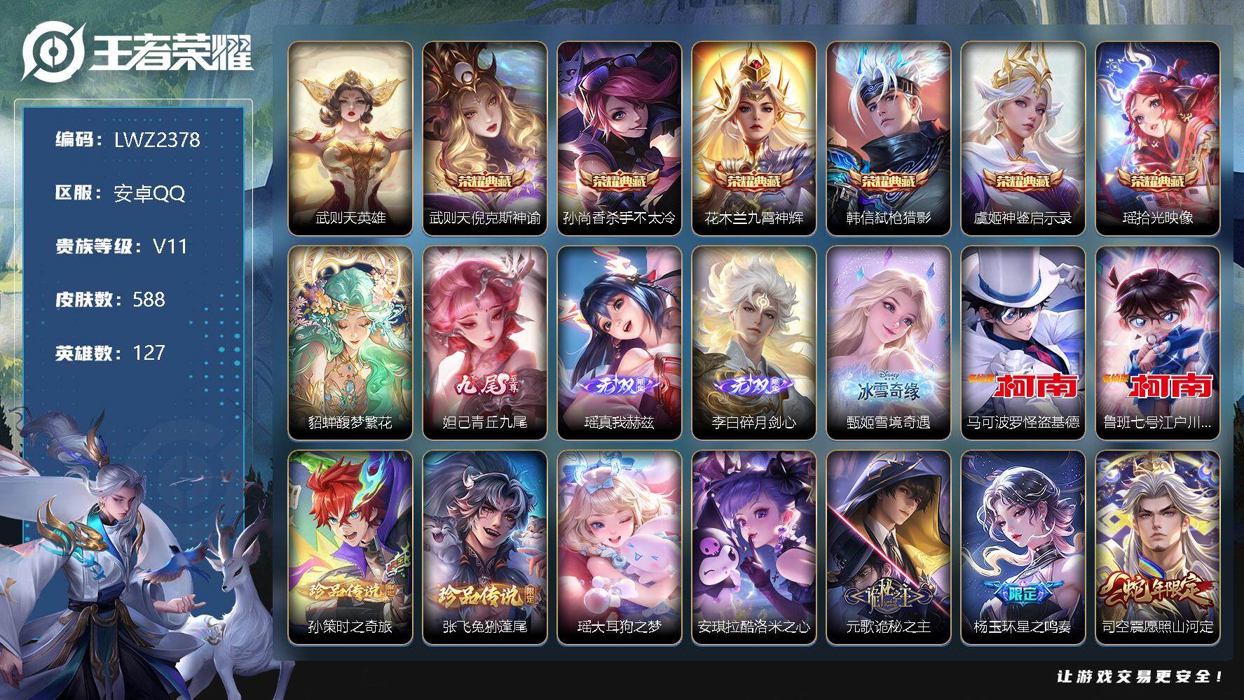 [12102215]瑶全皮/对抗路51段/发育路38段【特价急出/详情看图】:安卓Q-V11-最强王者段位-127英雄-588皮肤-6典藏-1珍品无双-4无双-6珍品传说-90传说-196史诗 【荣耀典藏】:武则天英雄,武则天倪克斯神谕,孙尚香杀手不太冷,花木兰九霄神辉,韩信弑枪猎影,虞姬神鉴启示录,瑶拾光映像 【珍品无双】:貂蝉馥梦繁花 【无双皮肤】:妲己青丘九尾,瑶真我赫兹,李白碎月剑心,甄姬雪境奇遇 【珍品传说】:马可波罗怪盗基德,鲁班七号江户川柯南,孙策时之奇旅,张飞兔狲蓬尾,瑶大耳狗之梦,安琪拉酷洛米之心 【传说皮肤】:元歌诡秘之主,杨玉环星之鸣奏,司空震愿照山河定,女娲愿照千秋盛,妲己愿照众生和,澜愿照九州拓,蔡文姬愿照福禄聚,虞姬愿照岁时盈,云缨幻光神枪,裴擒虎祥瑞亨通,嬴政玄雷天君,王昭君映山客,桑启鸣野蒿,夏侯惇霜北刀,朵莉亚心动手记,墨子黄金天蝎座,亚连落雪白狼,吕布曦玄引,貂蝉曦玄引,典韦战鼓燎原,孙尚香乘龙问璇玑,孙策乘龙淬吴钩,赵云乘龙铭钟鼎,澜逐花归海,艾琳觅芳踪,露娜霜月吟,甄姬至美化雀舞,大乔时之奇旅,兰陵王影龙天霄,吕布遇见神鼓,云缨鹤归松栖,马可波罗妄想实况,东皇太一灼幽烈阳,诸葛亮鹤羽星尊,夏洛特浮生妄,干将莫邪画中仙,花木兰燃星之曲,孙悟空齐天大圣,小乔山海琳琅生,李信山海炽霜斩,吕布怒海麟威,李白诗剑行,不知火舞绯月行,马可波罗深海之息,马超无双飞将,大乔挚爱花嫁,孙策挚爱之约,露娜启示之音,蔡文姬花朝如约,女娲补天,孙策末日机甲,瑶时之祈愿,裴擒虎寅虎赤拳,鲁班七号寅虎瑞焰,赵云淬星耀世,王昭君乞巧织情,西施游龙清影,曜李逍遥 ,周瑜音你心动,小乔音你心动,李元芳飞鸢探春,公孙离祈雪灵祝,诸葛亮时雨天司,镜炽阳神光,虞姬启明星使,孙悟空零号赤焰,关羽武圣,曜云鹰飞将,李信一念神魔,刘备时之恋人,伽罗太华,貂蝉猫影幻舞,张良黄金白羊座,干将莫邪久胜战神,虞姬云霓雀翎,达摩黄金狮子座,百里玄策白虎志,花木兰冠军飞将,梦奇胖达荣荣,后羿黄金射手座,杨戬永曜之星,诸葛亮武陵仙君,貂蝉仲夏夜之梦,李白凤求凰,孙尚香末日机甲,宫本武藏地狱之眼,孙悟空地狱火,吕布天魔缭乱,武则天海洋之心,狄仁杰超时空战士 【限定皮肤】:白起狰,夏侯惇霜北刀,暃埋骨钱,蔡文姬夏日便利店,大乔绒语心约,虞姬夏日便利店,姜子牙天穹之誓,杨戬破阵退雄兵,李白谪仙醉月,狄仁杰