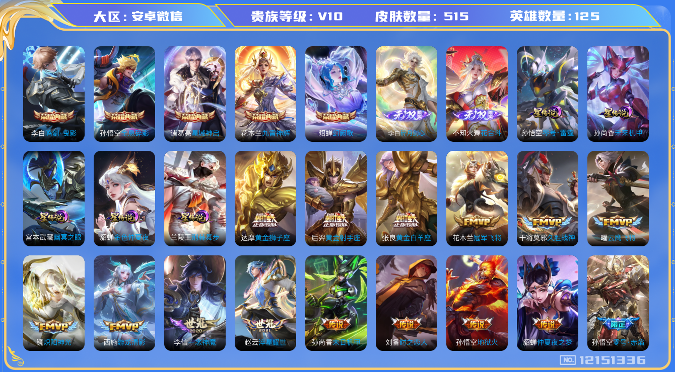 - [11553617]V9 18传说 126英雄 345皮肤 典藏英雄武则天 可修改实名 优质装备:久胜战神,末日机甲-孙尚香(绿蚂蚱),地狱火,仲夏夜之梦(大飞蛾),零号·赤焰,海洋之心,地狱之眼,超时空战士-狄仁杰,无双飞将 传说皮:幻光神枪 珍宝阁皮:万物之道,蔷薇恋人 限定皮:逐霄战戟,鸣野蒿,至尊宝,凤求凰(白切鸡),凤凰于飞,武陵仙君(小桃花),傲雪梅枪,瑞麟志(木兰年限),遇见飞天,高山流水,匿光决锋者,五谷丰年,冰锋战神,武圣,游园惊梦,梁祝,天狼狩猎者,逐梦之影,玄武志(苏烈年限),朱雀志(守约年限),辉光之辰,猪悟能,天魔缭乱,青春决赛季,美猴王,百木心枪,深海之息(深海大菠萝),枫霜尽 史诗皮:瑰影绮梦,化蝶舞,茶境仙,破空之剑,百相守梦-百里守约,百相守梦-黄忠,紫霞仙子,苍穹之光,电玩小子(小书包),黄金分割率,特工魅影,千年之狐,永昼,百相守梦(刘备),龙骑士(小龙虾),暗夜猫娘,晚萤,冰冠公主,青蛇,末日机甲-吕布,猫狗日记-孙策,时之恋人-孙尚香,节奏热浪,修罗,女仆咖啡,水果甜心,天才门将,星夜王子,心灵骇客,功夫厨神,德古拉伯爵,暗隐猎兽者,幽灵船长,鬼剑武藏,心灵战警,天秀·启明,舞动绿茵,地狱岩魂,纤云弄巧,繁星吟游(呼啦呼啦),拒霜思,缤纷独角兽,乘风破浪,逐浪之夏,水晶猎龙者,曙光守护者,箭羽风息,唤灵魅影,金属风暴,原初追逐者,圣诞狂欢,圣诞恋歌,鹰眼统帅,王者之锤,暗夜贵公子,魅力维加斯,黎明之约,天秀·音浪,无心,未来纪元-赵云