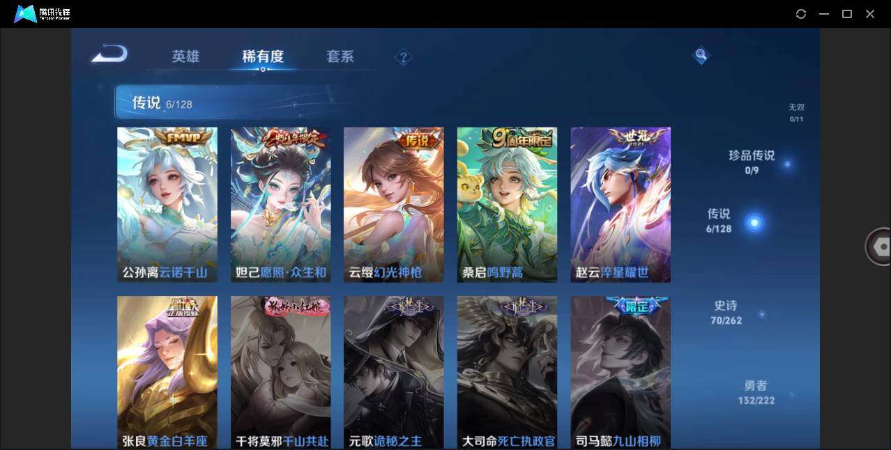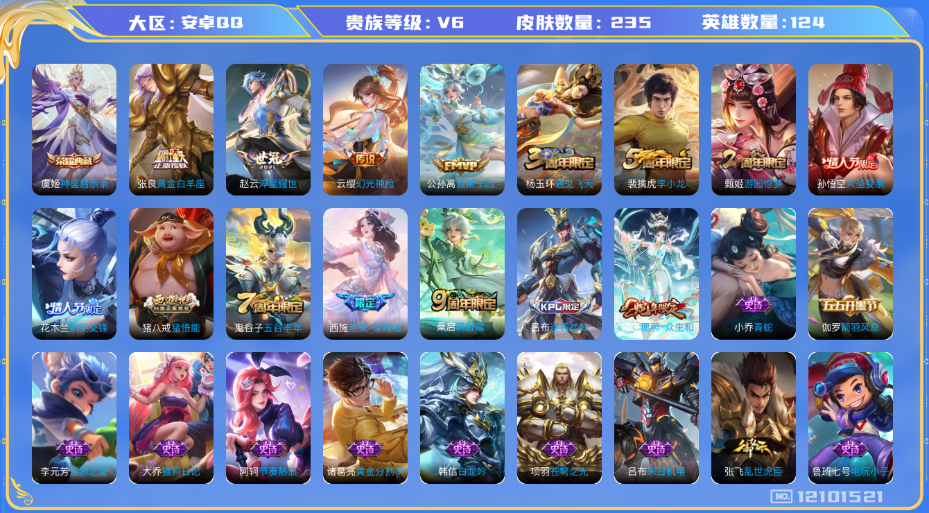 [12101521]【特价急出/详情看图】:安卓Q-V6-最强王者段位-124英雄-235皮肤-1典藏-6传说-70史诗