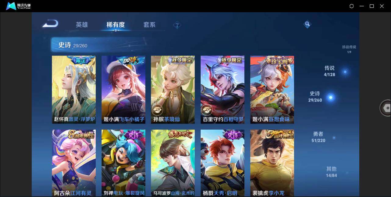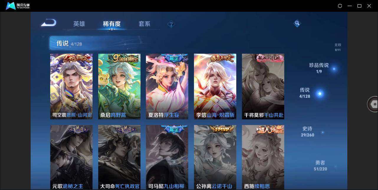 - [11525005]V6 3传说 123英雄 162皮肤 可修改实名 优质装备:神器·狴犴令 珍宝阁皮:蔷薇恋人,玩趣恶龙 限定皮:愿照·九州拓(澜年限),鸣野蒿,遇见飞天,五谷丰年,烈魂,天狼征服者,李小龙,逐梦之影,山海·玄木吟(马可年限) 史诗皮:化蝶舞,龙之律动,雪豹·霜爪,茶境仙,怒海争锋,电玩小子(小书包),特工魅影,江河有灵,蒙恬荣光圣徽,偶像歌手,末日机甲-吕布,节奏热浪,摇滚巨星,水果甜心,绅士熊喵,天才门将,星夜王子,心灵骇客,功夫厨神,德古拉伯爵,幽灵船长,鬼剑武藏,心灵战警,地狱岩魂,缤纷独角兽,逐浪之夏,水晶猎龙者,金属风暴,原初追逐者,圣诞狂欢,鹰眼统帅,魅力维加斯,黎明之约,未来纪元-赵云