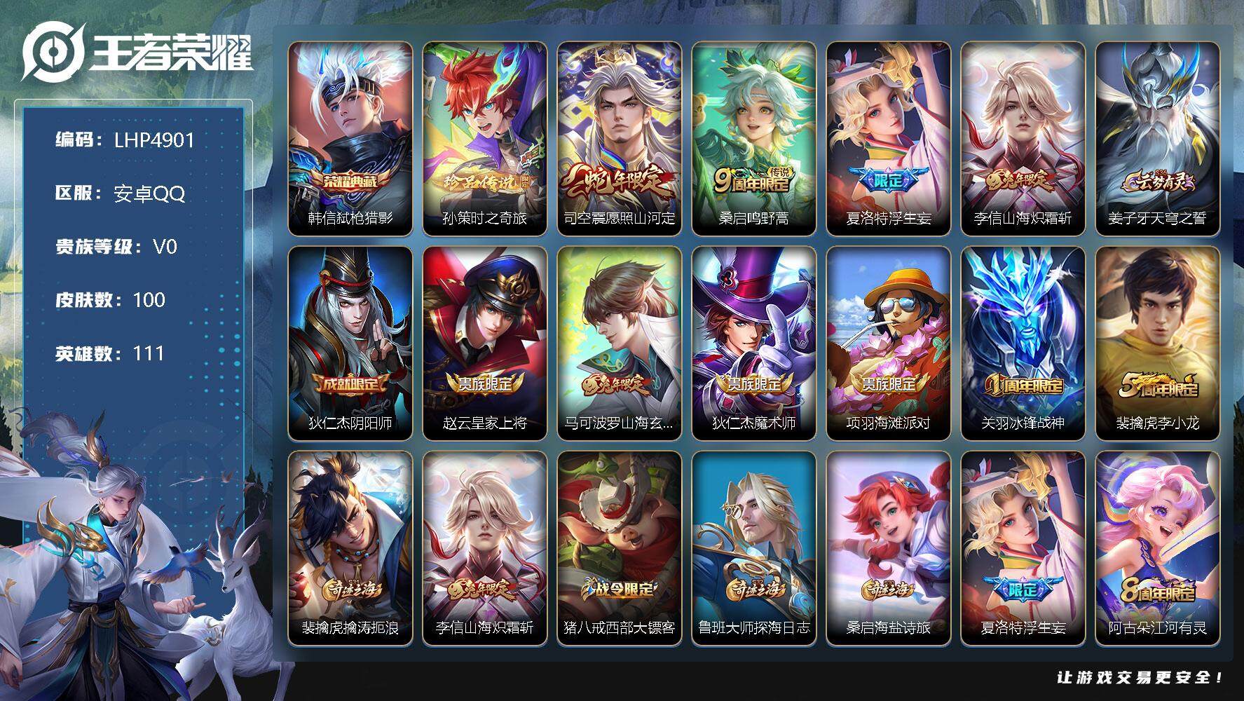 [12042900]【特价急出/详情看图】:安卓Q-V0-永恒钻石IV段位-111英雄-100皮肤-1典藏-1珍品传说-4传说-29史诗