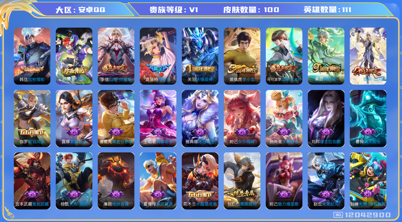 - [6856406]实名: 不可修改 贵族等级: V7 英雄数: 121 皮肤数: 190 传说皮: 云鹰飞将,仲夏夜之梦,霜月吟,典韦战鼓燎原,玄雷天君,幻光神枪 限定皮: 冰锋战神,李小龙,祈雪灵祝,游园惊梦,御风骁将,武圣,飞衡,至尊宝,五谷丰年,影龙天霄,愿照·山河定,愿照·九州拓
