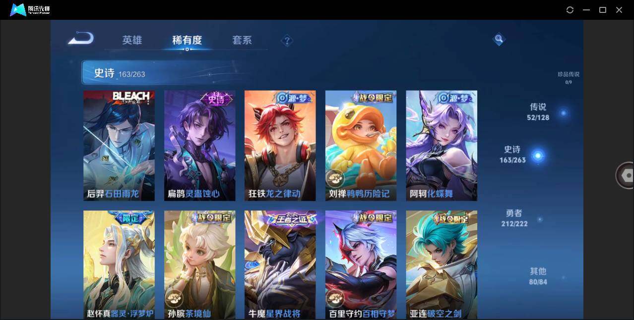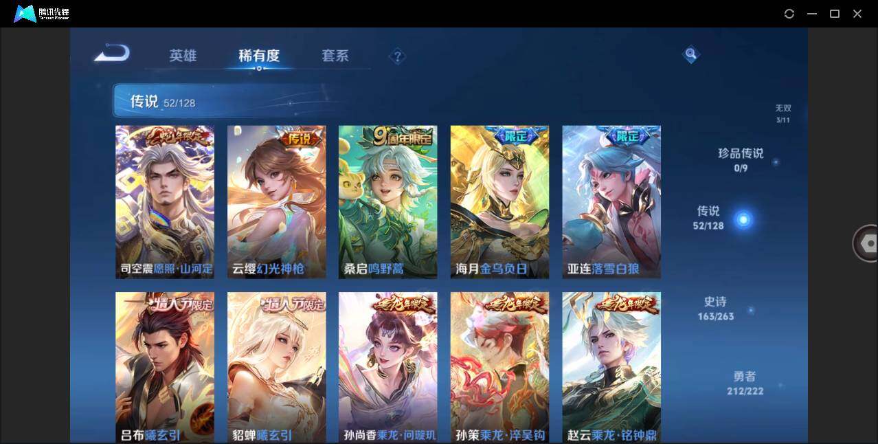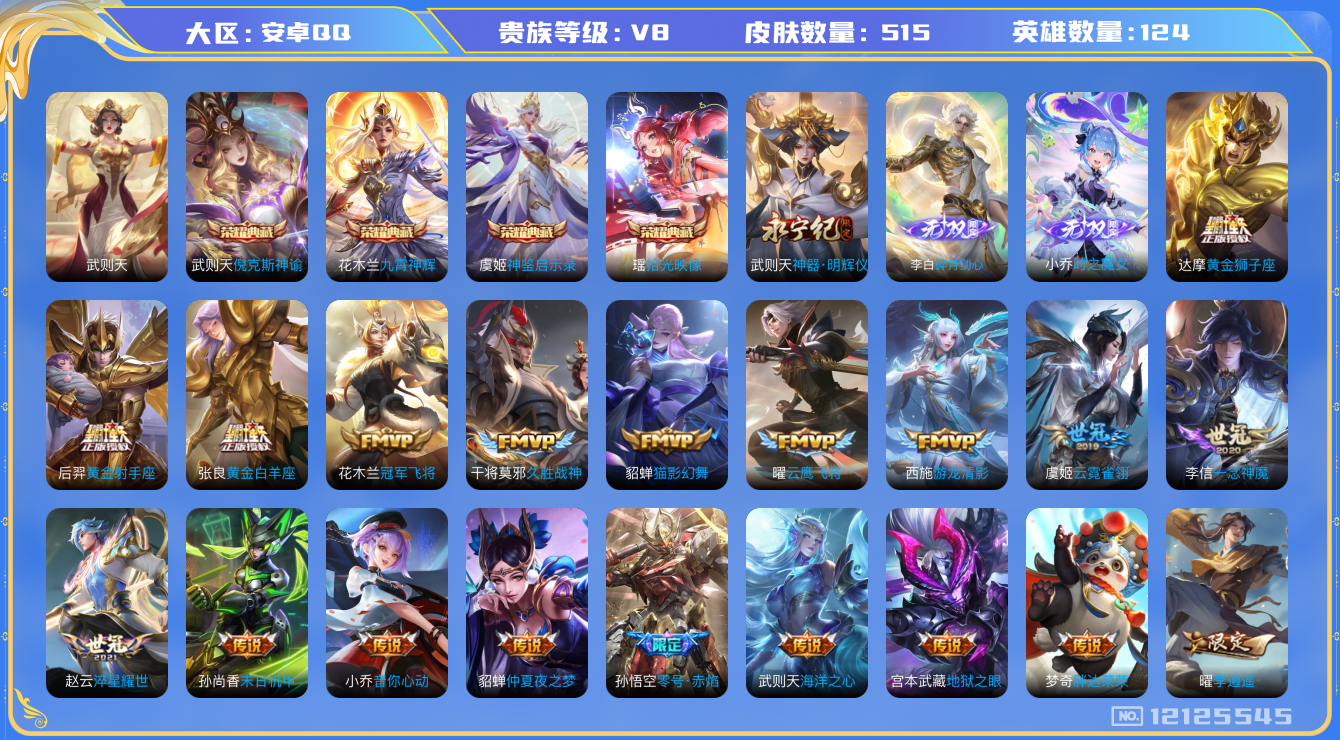 - [12090027]V7 6传说 123英雄 223皮肤 可修改实名 优质装备:久胜战神,云霓雀翎,胖达荣荣,超时空战士-狄仁杰 珍宝阁皮:优雅恋人,蔷薇恋人 限定皮:逐霄战戟,鸣野蒿,山海·碧波行(瑶年限),高山流水,怒海麟威,五谷丰年,逐梦之音,匿光启智者,时之奇旅-妲己,山海·玄木吟(马可年限) 史诗皮:化蝶舞,破空之剑,战舞者,琥珀纪元伽罗,决胜骁骑,蔬乡物语(鲁班七号),百相守梦-百里守约,百相守梦-黄忠,紫霞仙子,黄金分割率,特工魅影,千年之狐,江河有灵,匿光侦查者,雪夜绮愿(周瑜),百解令(蒙犽),高渐离燃音魔法,无限星赏官,偶像歌手,白蛇,电玩·爆裂旋风,暗夜猫娘,龙骑士(小龙虾),末日机甲-吕布,猫狗日记-孙策,猫狗日记-大乔,时之恋人-孙尚香,乱世虎臣,节奏热浪,女仆咖啡,水果甜心,星夜王子,心灵骇客,功夫厨神,暗隐猎兽者,幽灵船长,鬼剑武藏,心灵战警,天秀·启明,舞动绿茵,地狱岩魂,纤云弄巧,拒霜思,缤纷独角兽,乘风破浪,水晶猎龙者,曙光守护者,箭羽风息,金属风暴,圣诞狂欢,鹰眼统帅,暗夜贵公子,魅力维加斯,无心,未来纪元-赵云