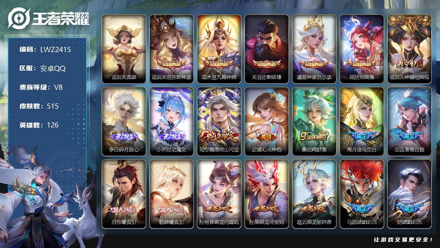 [12125545]中路38段/对抗路36段【特价急出/详情看图】:安卓Q-V8-最强王者段位-126英雄-515皮肤-5典藏-3无双-52传说-162史诗 【荣耀典藏】:武则天英雄,武则天倪克斯神谕,花木兰九霄神辉,关羽赤影疾锋,虞姬神鉴启示录,瑶拾光映像 【无双皮肤】:武则天神器明辉仪,李白碎月剑心,小乔时之魔女 【传说皮肤】:司空震愿照山河定,云缨幻光神枪,桑启鸣野蒿,海月金乌负日,亚连落雪白狼,吕布曦玄引,貂蝉曦玄引,孙尚香乘龙问璇玑,孙策乘龙淬吴钩,赵云乘龙铭钟鼎,马超琥珀纪元,铠琥珀纪元,澜逐花归海,狄仁杰夜礼服假面,王昭君永恒水手月亮,上官婉儿妄想奇谈,马可波罗妄想实况,花木兰燃星之曲,不知火舞绯月行,王昭君星穹之声,孙尚香异界灵契,貂蝉遇见胡旋,赵云淬星耀世,西施游龙清影,曜李逍遥 ,小乔音你心动,兰陵王默契交锋,公孙离祈雪灵祝,诸葛亮时雨天司,虞姬启明星使,孙悟空零号赤焰,关羽武圣,曜云鹰飞将,李信一念神魔,伽罗太华,貂蝉猫影幻舞,张良黄金白羊座,干将莫邪久胜战神,虞姬云霓雀翎,达摩黄金狮子座,百里玄策白虎志,花木兰冠军飞将,梦奇胖达荣荣,后羿黄金射手座,诸葛亮武陵仙君,貂蝉仲夏夜之梦,李白凤求凰,孙尚香末日机甲,宫本武藏地狱之眼,吕布天魔缭乱,武则天海洋之心,狄仁杰超时空战士 【限定皮肤】:白起狰,蒙犽顽岩魄,蔡文姬夏日便利店,大乔绒语心约,虞姬夏日便利店,姜子牙天穹之誓,杨戬破阵退雄兵,狄仁杰阴阳师,虞姬凯尔特女王,赵云皇家上将,墨子神迹守卫,嬴政优雅恋人,嬴政白昼王子,孙尚香蔷薇恋人,孙尚香异界灵契,鲁班七号狮舞东方,鲁班七号乒乒小将,庄周蜃楼王,庄周高山流水,高渐离死亡摇滚,阿轲迷踪丽影,钟无艳王者之锤,钟无艳超时空战士,孙膑妖精王,孙膑天狼运算者,扁鹊炼金王,扁鹊奇幻香踪,白起夜都怪侠,芈月重明,芈月白晶晶,芈月幻夜卜梦,吕布天魔缭乱,吕布猎兽之王,吕布御风骁将,周瑜赤莲之焰,元歌云间偶戏,元歌无心,夏侯惇朔风刀,夏侯惇匿光决锋者,甄姬女儿国国王,甄姬游园惊梦,甄姬落雪兰心,曹操烛龙,曹操天狼征服者,典韦穷奇,典韦蓝屏警告,马可波罗逐梦之星,马可波罗暗影游猎,马可波罗妄想实况,狄仁杰魔术师,狄仁杰万华元夜,达摩星际陆战队,达摩沙漠行僧,项羽海滩派对,老夫子圣诞老人,老夫子醍醐杖,老夫子航海奇遇记,关羽冰锋战神,关羽武圣,貂蝉遇见胡旋,安琪拉魔法小厨娘,程咬