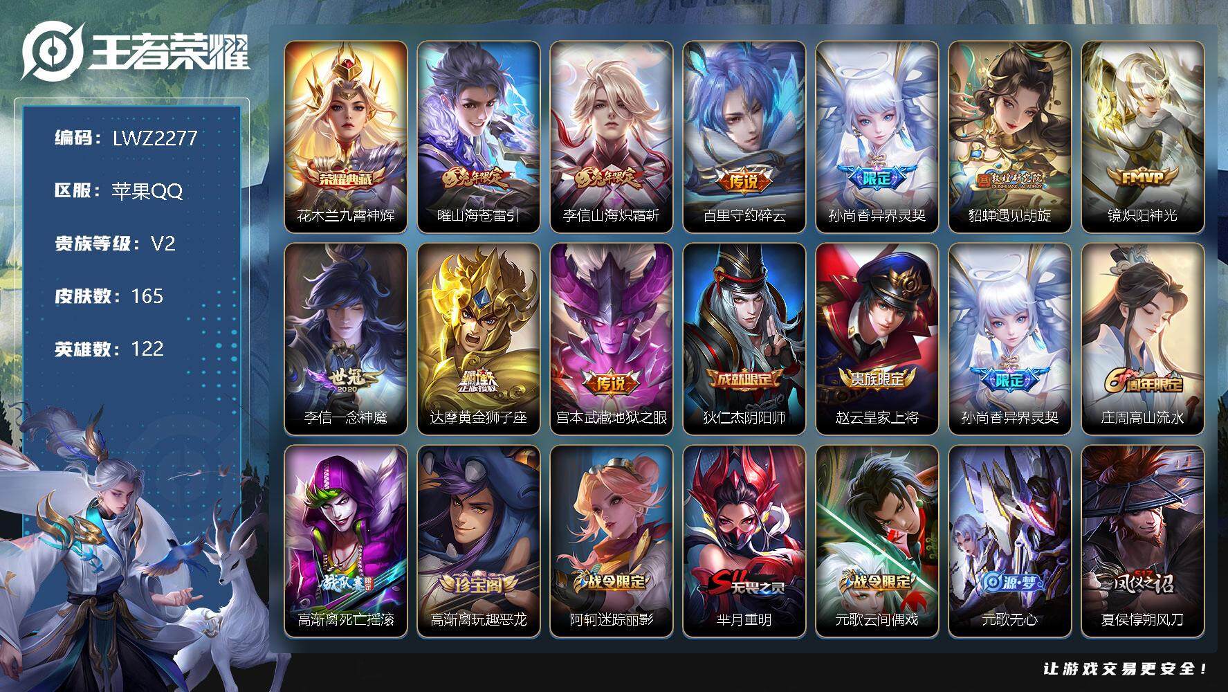 [12102721]【特价急出/详情看图】:苹果Q-V2-永恒钻石V段位-122英雄-165皮肤-1典藏-9传说-54史诗 【荣耀典藏】:花木兰九霄神辉 【传说皮肤】:曜山海苍雷引,李信山海炽霜斩,百里守约碎云,孙尚香异界灵契,貂蝉遇见胡旋,镜炽阳神光,李信一念神魔,达摩黄金狮子座,宫本武藏地狱之眼 【限定皮肤】:狄仁杰阴阳师,赵云皇家上将,孙尚香异界灵契,庄周高山流水,高渐离死亡摇滚,高渐离玩趣恶龙,阿轲迷踪丽影,芈月重明,元歌云间偶戏,元歌无心,夏侯惇朔风刀,典韦穷奇,典韦蓝屏警告,马可波罗暗影游猎,马可波罗山海玄木吟,狄仁杰魔术师,狄仁杰万华元夜,达摩沙漠行僧,项羽海滩派对,老夫子醍醐杖,貂蝉遇见胡旋,程咬金演武夺筹,刘邦夺宝奇兵,韩信傲雪梅枪,兰陵王金庭之子,亚瑟潮玩骑士王,孙悟空至尊宝,孙悟空孙行者,牛魔御旌,李元芳云中旅人,钟馗驱傩正仪,雅典娜单词大作战,太乙真人饕餮,鬼谷子原初探秘者,鬼谷子五谷丰年,黄忠烈魂,苏烈千军破阵,百里守约朱雀志,弈星混沌棋,沈梦溪大漠名商,明世隐疑决卦,裴擒虎李小龙,裴擒虎擒涛扼浪,狂铁御狮,米莱狄御霄,云中君纤云弄巧,李信山海炽霜斩,盾山御銮,猪八戒西部大镖客,猪八戒猪悟能,上官婉儿梁祝,上官婉儿天狼绘梦者,嫦娥拒霜思,嫦娥暖冬兔眠,曜山海苍雷引,蒙犽狂想玩偶喵,鲁班大师探海日志,桑启海盐诗旅,暃星界游侠,阿古朵江河有灵,张良古海寻踪 【年限皮肤】:百里守约朱雀志,马超神威,黄忠烈魂,马可波罗山海玄木吟,李信山海炽霜斩,曜山海苍雷引 【赛季限定】:芈月重明,夏侯惇朔风刀,典韦穷奇,狄仁杰万华元夜,达摩沙漠行僧,老夫子醍醐杖,程咬金演武夺筹,兰陵王金庭之子,张良古海寻踪,牛魔御旌,李元芳云中旅人,钟馗驱傩正仪,太乙真人饕餮,鬼谷子原初探秘者,苏烈千军破阵,弈星混沌棋,沈梦溪大漠名商,明世隐疑决卦,裴擒虎擒涛扼浪,狂铁御狮,米莱狄御霄,盾山御銮,鲁班大师探海日志,桑启海盐诗旅 【战令限定】:阿轲迷踪丽影,元歌云间偶戏,典韦蓝屏警告,马可波罗暗影游猎,刘邦夺宝奇兵,亚瑟潮玩骑士王,雅典娜单词大作战,猪八戒西部大镖客,嫦娥暖冬兔眠,蒙犽狂想玩偶喵,暃星界游侠 【史诗皮肤】:露娜紫霞仙子,赵云皇家上将,赵云未来纪元,貂蝉圣诞恋歌,王昭君偶像歌手,狄仁杰魔术师,廉颇地狱岩魂,孙尚香水果甜心,妲己魅力维加斯,妲己女仆咖啡,墨子金属风暴,曹操幽灵船长,李白
