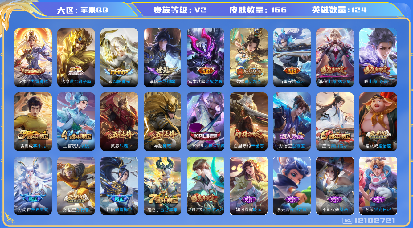 - [11625776]V7 1典藏 9传说 124英雄 212皮肤 可修改实名 女号 优质装备:杀手不太冷,黄金射手座,云鹰飞将(小将军),久胜战神,炽阳神光,一念神魔 传说皮:幻光神枪 珍宝阁皮:万物之道,玩趣恶龙 限定皮:鸣野蒿,至尊宝,白虎志(电光耗子),凤求凰(白切鸡),遇见飞天,高山流水,五谷丰年,冰锋战神,梁祝,天狼溯光者,李小龙,逐梦之影,辉光之辰,如梦令-后羿,青春决赛季,蜜橘之夏 史诗皮:紫霞仙子,苍穹之光,电玩小子(小书包),白龙吟,黄金分割率,特工魅影,千年之狐,电玩·爆裂旋风,江河有灵,蒙恬荣光圣徽,偶像歌手,龙骑士(小龙虾),晚萤,末日机甲-吕布,猫狗日记-孙策,乱世虎臣,节奏热浪,修罗,女仆咖啡,摇滚巨星,水果甜心,天才门将,星夜王子,心灵骇客,功夫厨神,暗隐猎兽者,幽灵船长,鬼剑武藏,心灵战警,舞动绿茵,地狱岩魂,缤纷独角兽,乘风破浪,逐浪之夏,水晶猎龙者,曙光守护者,箭羽风息,金属风暴,原初追逐者,圣诞狂欢,圣诞恋歌,鹰眼统帅,魅力维加斯,黎明之约,未来纪元-赵云