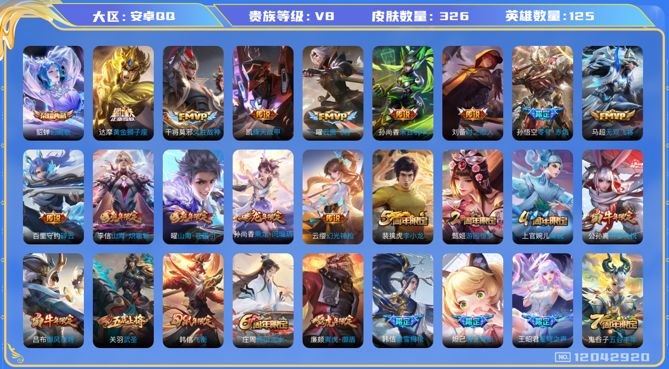 [12042920]发育路30段【特价急出/详情看图】:安卓Q-V8-最强王者段位-125英雄-326皮肤-1典藏-22传说-104史诗 【荣耀典藏】:貂蝉幻阙歌 【传说皮肤】:女娲愿照千秋盛,云缨幻光神枪,桑启鸣野蒿,孙尚香乘龙问璇玑,孙悟空齐天大圣,曜山海苍雷引,李信山海炽霜斩,吕布怒海麟威,不知火舞绯月行,王昭君星穹之声,百里守约碎云,马超无双飞将,公孙离祈雪灵祝,铠绛天战甲,虞姬启明星使,孙悟空零号赤焰,关羽武圣,曜云鹰飞将,刘备时之恋人,干将莫邪久胜战神,达摩黄金狮子座,孙尚香末日机甲 【限定皮肤】:蒙犽顽岩魄,姜子牙天穹之誓,杨戬破阵退雄兵,狄仁杰阴阳师,廉颇寅虎御盾,赵云皇家上将,妲己时之奇旅,嬴政优雅恋人,孙尚香蔷薇恋人,庄周高山流水,钟无艳超时空战士,扁鹊奇幻香踪,芈月幻夜卜梦,吕布猎兽之王,吕布御风骁将,元歌云间偶戏,元歌无心,夏侯惇朔风刀,甄姬游园惊梦,甄姬落雪兰心,典韦蓝屏警告,马可波罗暗影游猎,马可波罗山海玄木吟,狄仁杰魔术师,狄仁杰万华元夜,达摩沙漠行僧,项羽海滩派对,老夫子醍醐杖,关羽武圣,程咬金演武夺筹,韩信飞衡,韩信傲雪梅枪,王昭君午后时光,王昭君星穹之声,兰陵王金庭之子,不知火舞绯月行,孙悟空零号赤焰,孙悟空齐天大圣,牛魔御旌,后羿圣弓游侠,李元芳银河之约,李元芳云中旅人,虞姬启明星使,钟馗驱傩正仪,杨戬潮玩骑兵,女娲朔望之晖,干将莫邪真爱魔法,蔡文姬繁星吟游,鬼谷子原初探秘者,鬼谷子五谷丰年,黄忠火炮绅士,苏烈千军破阵,百里玄策原初追逐者,弈星混沌棋,梦奇顽趣,公孙离祈雪灵祝,沈梦溪星空之诺,沈梦溪大漠名商,明世隐疑决卦,裴擒虎李小龙,裴擒虎擒涛扼浪,狂铁电玩高手,米莱狄御霄,云中君纤云弄巧,李信山海炽霜斩,盾山御銮,猪八戒西部大镖客,上官婉儿梁祝,嫦娥拒霜思,嫦娥暖冬兔眠,曜山海苍雷引,西施玲珑珍味,鲁班大师探海日志,桑启海盐诗旅,暃星界游侠,戈娅驭风魔法,艾琳流音漫舞,司空震地狱燃心,阿古朵江河有灵,张良古海寻踪,蒙犽百解令,蒙恬荣光圣徽,高渐离燃音魔法,妲己灵卜魔法,鬼谷子天穹祈灯,伽罗琥珀纪元,姬小满妄想食味,孙尚香乘龙问璇玑,沈梦溪龙舞盛年,刘邦剑破天穹,程咬金群星魔术团,周瑜熔金海岸 【年限皮肤】:廉颇寅虎御盾,公孙离祈雪灵祝,吕布御风骁将,韩信飞衡,关羽武圣,马可波罗山海玄木吟,李信山海炽霜斩,曜山海苍雷引,孙尚香乘龙问璇玑 【赛季