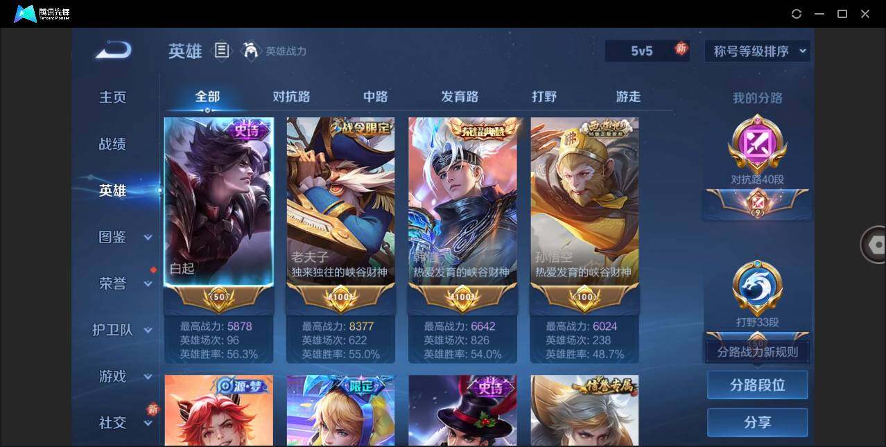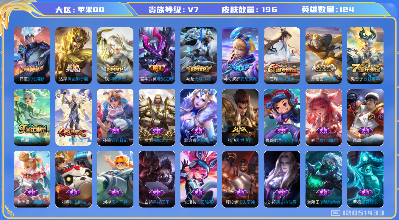 [12051433]对抗路40段/打野33段【特价急出/详情看图】:苹果Q-V7-永恒钻石III段位-124英雄-196皮肤-1典藏-7传说-60史诗