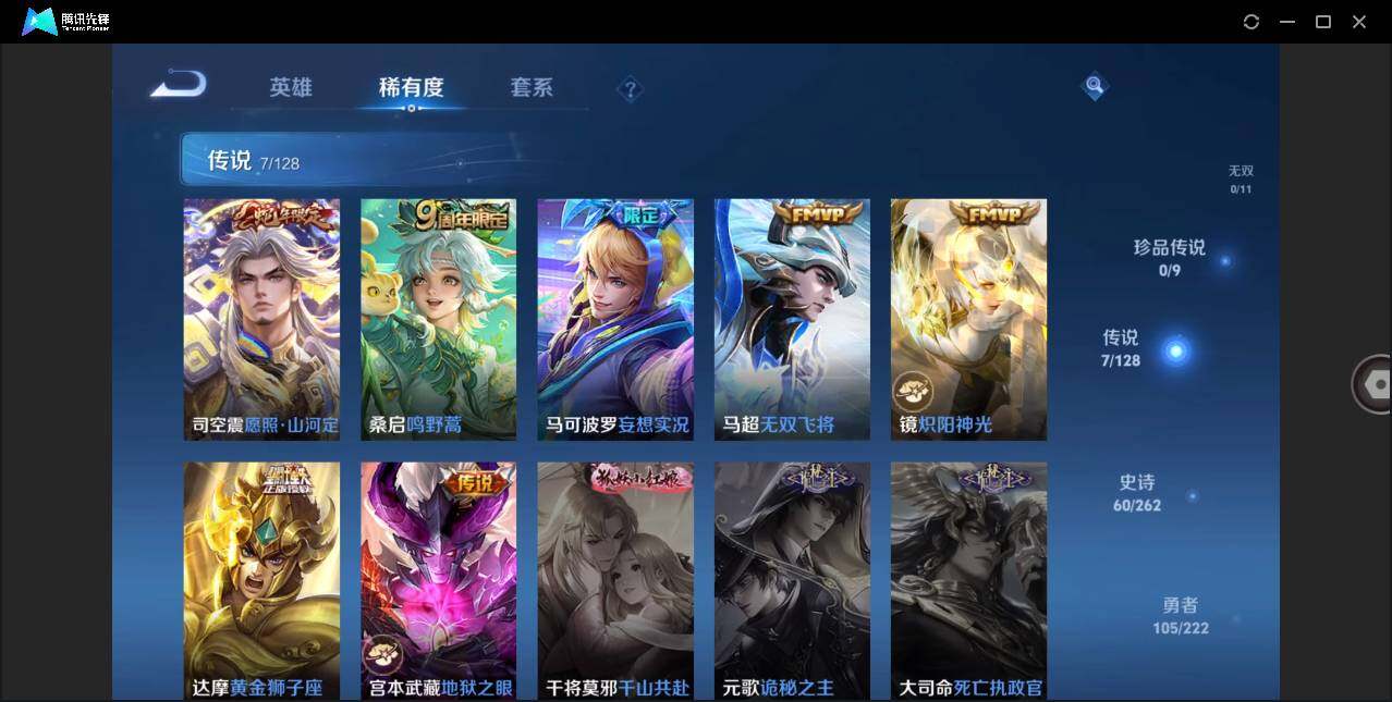- [12293122]V7 1典藏 1无双 10传说 123英雄 238皮肤 可修改实名 优质装备:鸣剑·曳影,天机白泽,云鹰飞将(小将军),一念神魔,末日机甲-孙尚香(绿蚂蚱),地狱之眼,时之恋人-刘备(电焊工),末日机甲-孙策,碎云 珍宝阁皮:妄想食味,胡桃夹子,蔷薇恋人 限定皮:傲雪梅枪,遇见飞天,高山流水,诗剑行,齐天大圣,怒海麟威,五谷丰年,梁祝,匿光追影者,玉兔公主 史诗皮:赞萌露比,星界战将,百相守梦-黄忠,特工魅影,千年之狐,江河有灵,末日机甲-莱西奥,偶像歌手,猫狗日记-孙策,猫狗日记-大乔,时之恋人-孙尚香,节奏热浪,修罗,女仆咖啡,摇滚巨星,水果甜心,天才门将,星夜王子,功夫厨神,德古拉伯爵,暗隐猎兽者,幽灵船长,鬼剑武藏,舞动绿茵,地狱岩魂,纤云弄巧,繁星吟游(呼啦呼啦),拒霜思,缤纷独角兽,乘风破浪,水晶猎龙者,曙光守护者,热力回旋,箭羽风息,金属风暴,圣诞恋歌,鹰眼统帅,魅力维加斯,黎明之约,赏金猎手,奇遇舞章,无心,未来纪元-赵云