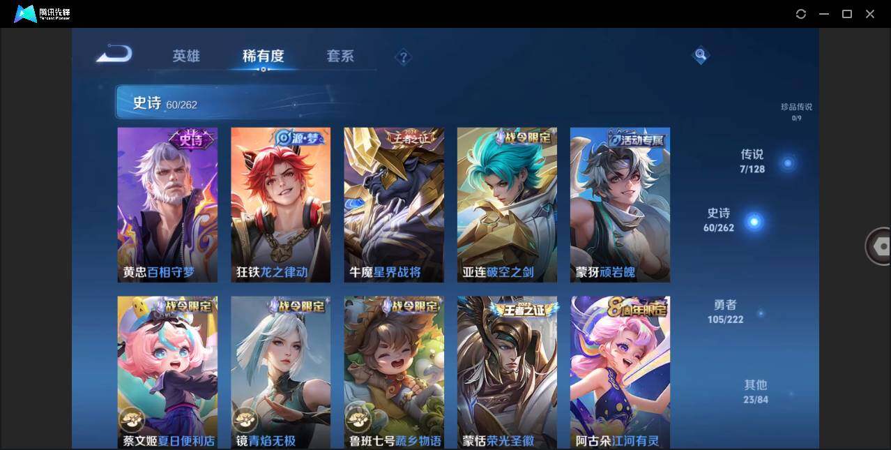 - PX_2095368-88 安卓QQ/尊贵铂金/53皮肤/75英雄/0典藏/0珍品无双/0无双/0珍品传说/5传说/8史诗/6稀有英雄 【5 传说皮肤】久胜战神 干将莫邪,愿照·九州拓 澜,幻光神枪 云缨,愿照·岁时盈 虞姬,鸣野蒿 桑启, 【8 史诗皮肤】魅力维加斯 妲己,鹰眼统帅 狄仁杰,特工魅影 百里守约,猫狗日记 孙策,皇家上将 赵云,圣诞狂欢 吕布,蔷薇恋人 孙尚香,心灵骇客 安琪拉,
