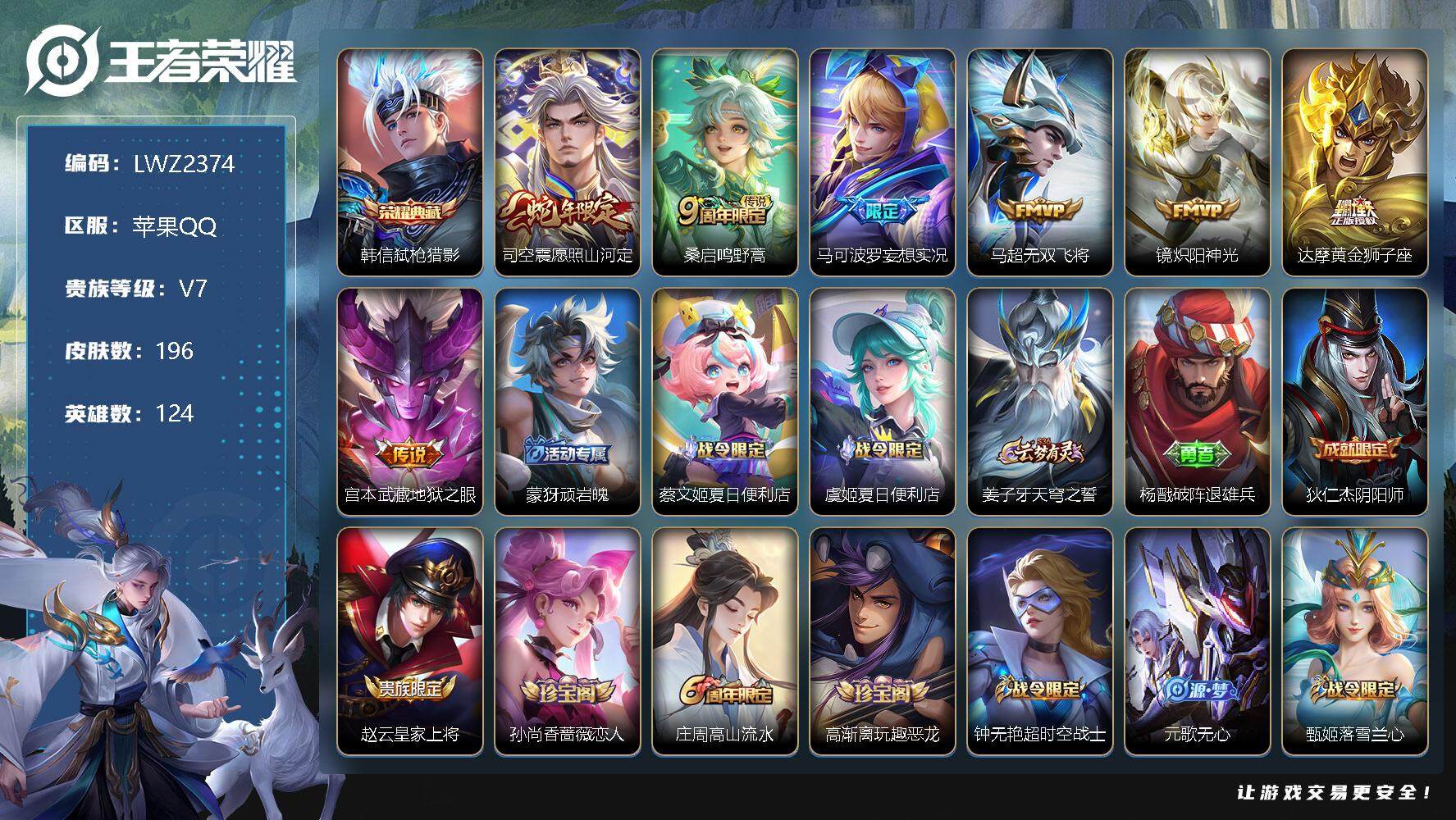 [12051433]对抗路40段/打野33段【特价急出/详情看图】:苹果Q-V7-永恒钻石III段位-124英雄-196皮肤-1典藏-7传说-60史诗 【荣耀典藏】:韩信弑枪猎影 【传说皮肤】:司空震愿照山河定,桑启鸣野蒿,马可波罗妄想实况,马超无双飞将,镜炽阳神光,达摩黄金狮子座,宫本武藏地狱之眼 【限定皮肤】:蒙犽顽岩魄,蔡文姬夏日便利店,虞姬夏日便利店,姜子牙天穹之誓,杨戬破阵退雄兵,狄仁杰阴阳师,赵云皇家上将,孙尚香蔷薇恋人,庄周高山流水,高渐离玩趣恶龙,钟无艳超时空战士,元歌无心,甄姬落雪兰心,典韦蓝屏警告,马可波罗妄想实况,狄仁杰魔术师,达摩沙漠行僧,项羽海滩派对,老夫子航海奇遇记,王昭君午后时光,兰陵王金庭之子,孙悟空孙行者,李元芳银河之约,李元芳云中旅人,雅典娜黎明之约,鬼谷子五谷丰年,苏烈千军破阵,百里玄策原初追逐者,梦奇顽趣,沈梦溪大漠名商,裴擒虎擒涛扼浪,狂铁电玩高手,西施玲珑珍味,鲁班大师探海日志,桑启海盐诗旅,戈娅驭风魔法,阿古朵江河有灵,张良古海寻踪,蒙恬荣光圣徽,鬼谷子天穹祈灯,沈梦溪龙舞盛年,鲁班七号蔬乡物语,李元芳蔬乡物语,刘邦剑破天穹,程咬金群星魔术团,镜青焰无极,项羽苍威无极,刘备异域游侠,周瑜熔金海岸 【赛季限定】:达摩沙漠行僧,兰陵王金庭之子,张良古海寻踪,李元芳云中旅人,雅典娜黎明之约,苏烈千军破阵,百里玄策原初追逐者,梦奇顽趣,沈梦溪大漠名商,裴擒虎擒涛扼浪,鲁班大师探海日志,桑启海盐诗旅,鬼谷子天穹祈灯,蒙恬荣光圣徽,刘邦剑破天穹,姜子牙天穹之誓 【战令限定】:蔡文姬夏日便利店,虞姬夏日便利店,钟无艳超时空战士,甄姬落雪兰心,典韦蓝屏警告,老夫子航海奇遇记,王昭君午后时光,李元芳银河之约,狂铁电玩高手,西施玲珑珍味,戈娅驭风魔法,鲁班七号蔬乡物语,李元芳蔬乡物语,镜青焰无极,项羽苍威无极 【史诗皮肤】:鲁班七号电玩小子,项羽苍穹之光,赵云皇家上将,赵云未来纪元,貂蝉圣诞恋歌,甄姬冰雪圆舞曲,狄仁杰魔术师,宫本武藏鬼剑武藏,孙尚香蔷薇恋人,孙尚香水果甜心,嬴政摇滚巨星,妲己女仆咖啡,墨子金属风暴,吕布圣诞狂欢,刘禅绅士熊喵,曹操幽灵船长,李白千年之狐,张飞乱世虎臣,花木兰水晶猎龙者,刘邦德古拉伯爵,夏侯惇乘风破浪,小乔缤纷独角兽,兰陵王暗隐猎兽者,亚瑟心灵战警,雅典娜冰冠公主,安琪拉心灵骇客,百里守约特工魅影,铠曙光守护者,蔡文姬舞动绿茵