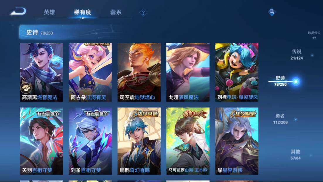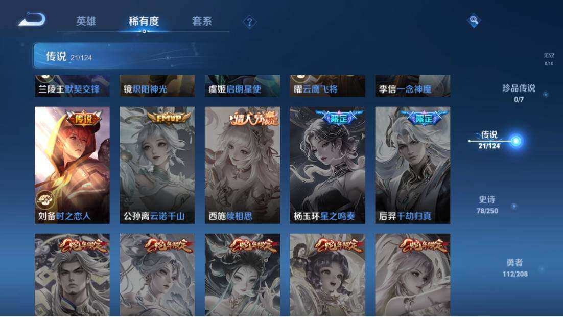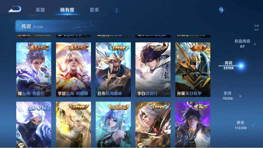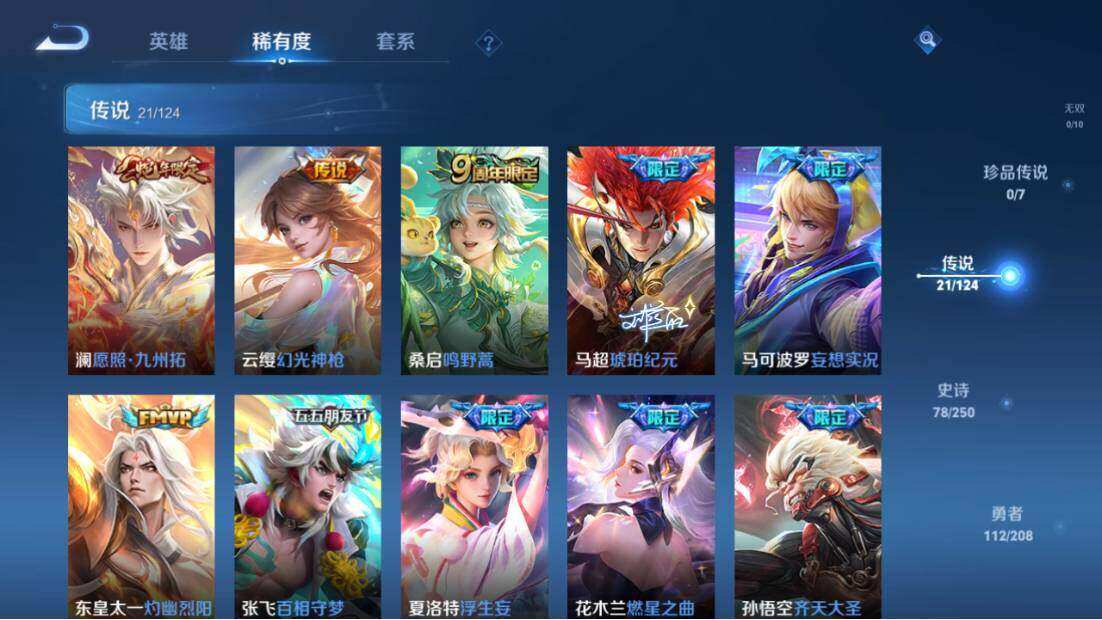 【传说皮肤】:澜愿照九州拓,云缨幻光神枪,桑启鸣野蒿,马超琥珀纪元,马可波罗妄想实况,东皇太一灼幽烈阳,张飞百相守梦,夏洛特浮生妄,花木兰燃星之曲,孙悟空齐天大圣,曜山海苍雷引,李信山海炽霜斩,吕布怒海麟威,李白诗剑行,孙策末日机甲,兰陵王默契交锋,镜炽阳神光,虞姬启明星使,曜云鹰飞将,李信一念神魔,刘备时之恋人