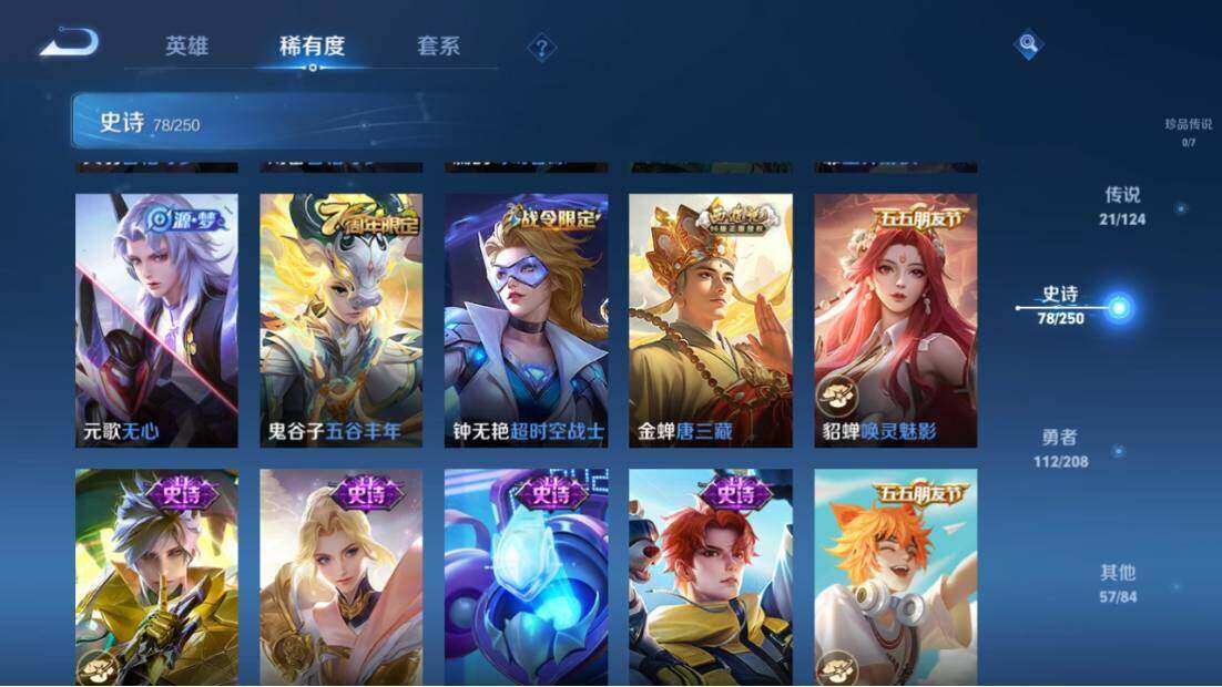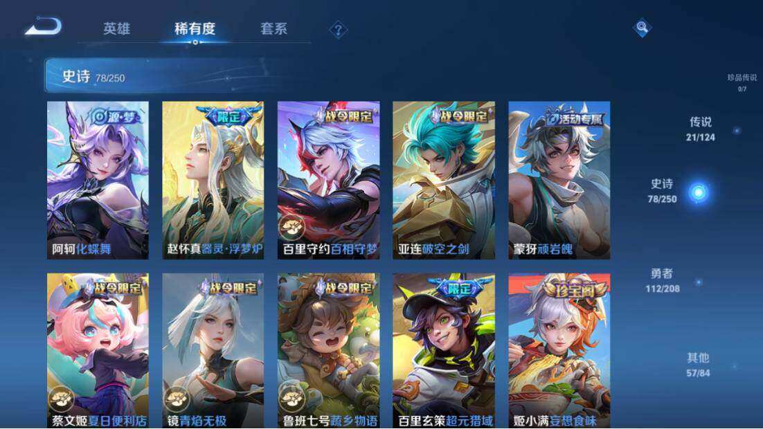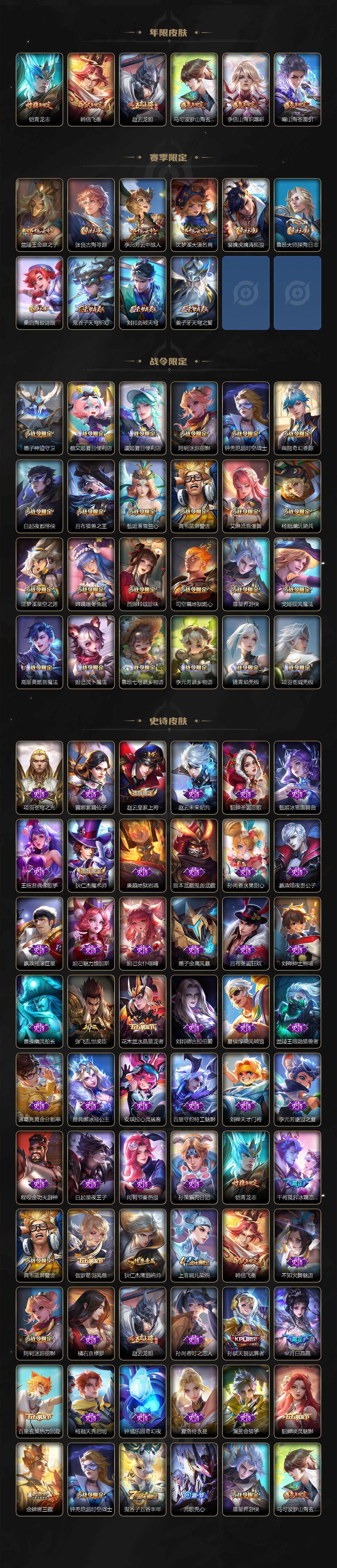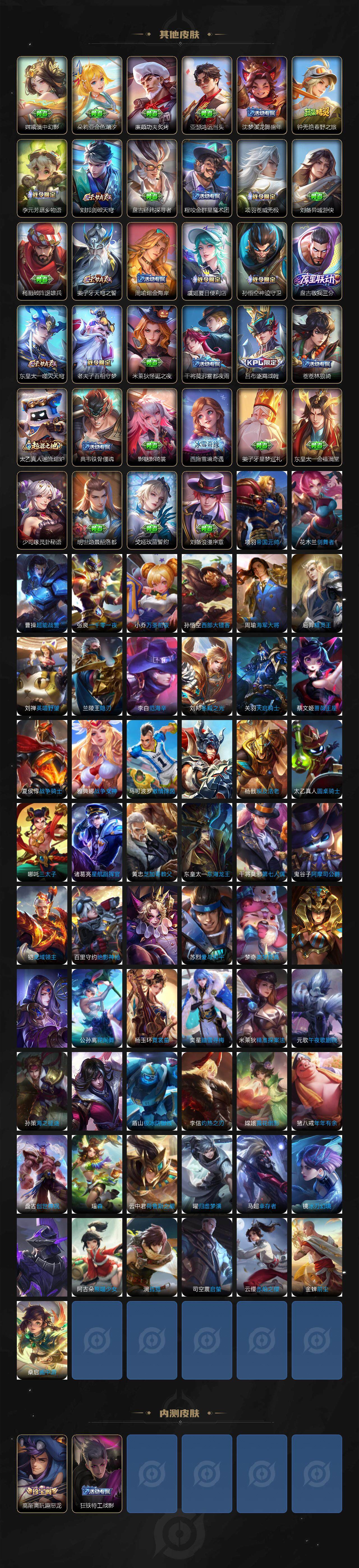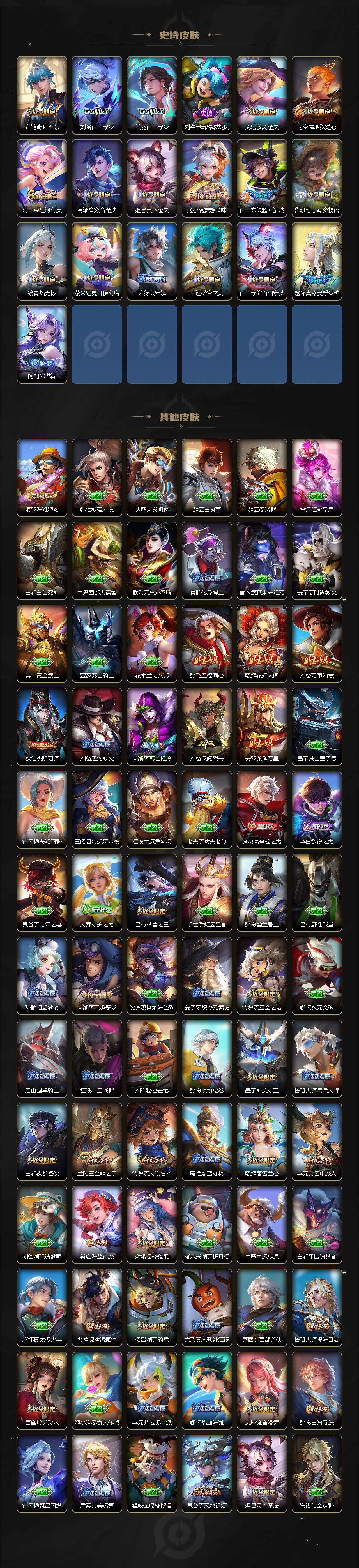 【限定皮肤】:蒙犽顽岩魄,蔡文姬夏日便利店,虞姬夏日便利店,姜子牙天穹之誓,杨戬破阵退雄兵,狄仁杰阴阳师,赵云皇家上将,赵云龙胆,墨子神迹守卫,高渐离死亡摇滚,高渐离玩趣恶龙,阿轲迷踪丽影,钟无艳超时空战士,孙膑天狼运算者,扁鹊奇幻香踪,白起夜都怪侠,芈月白晶晶,吕布猎兽之王,元歌无心,甄姬落雪兰心,典韦蓝屏警告,马可波罗山海玄木吟,马可波罗妄想实况,狄仁杰魔术师,项羽海滩派对,关羽百相守梦,韩信飞衡,兰陵王默契交锋,兰陵王金庭之子,花木兰燃星之曲,孙悟空齐天大圣,刘备百相守梦,张飞百相守梦,李元芳云中旅人,虞姬启明星使,杨戬潮玩骑兵,干将莫邪冰霜恋舞曲,鬼谷子五谷丰年,铠青龙志,沈梦溪星空之诺,沈梦溪大漠名商,裴擒虎擒涛扼浪,李信山海炽霜斩,上官婉儿梁祝,嫦娥暖冬兔眠,曜山海苍雷引,西施玲珑珍味,鲁班大师探海日志,桑启海盐诗旅,夏洛特浮生妄,金蝉唐三藏,暃星界游侠,戈娅驭风魔法,艾琳流音漫舞,司空震地狱燃心,阿古朵江河有灵,张良古海寻踪,高渐离燃音魔法,妲己灵卜魔法,鬼谷子天穹祈灯,马超琥珀纪元,姬小满妄想食味,百里玄策超元猎域,沈梦溪龙舞盛年,鲁班七号蔬乡物语,李元芳蔬乡物语,刘邦剑破天穹,程咬金群星魔术团,镜青焰无极,项羽苍威无极,刘备异域游侠,周瑜熔金海岸