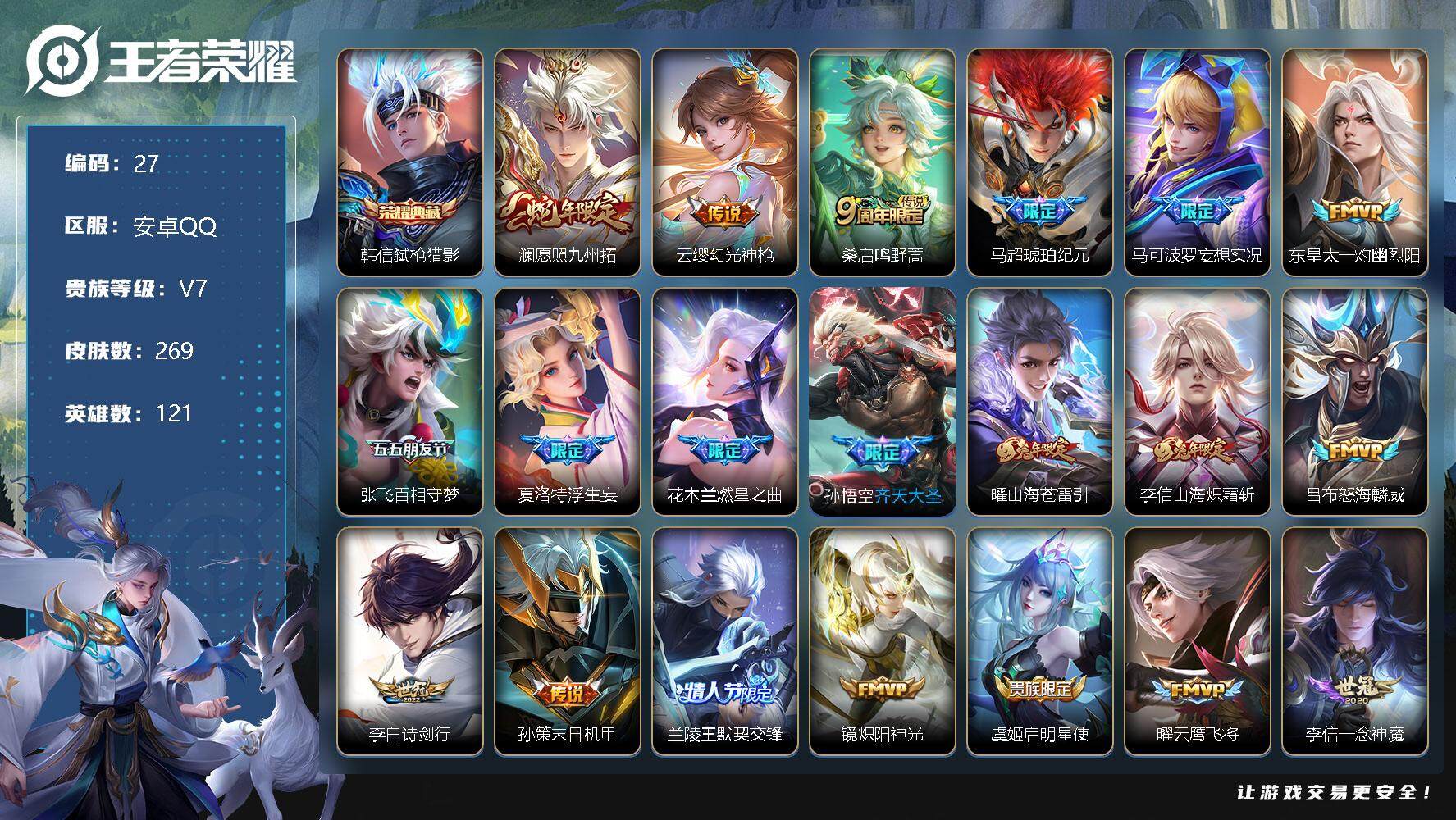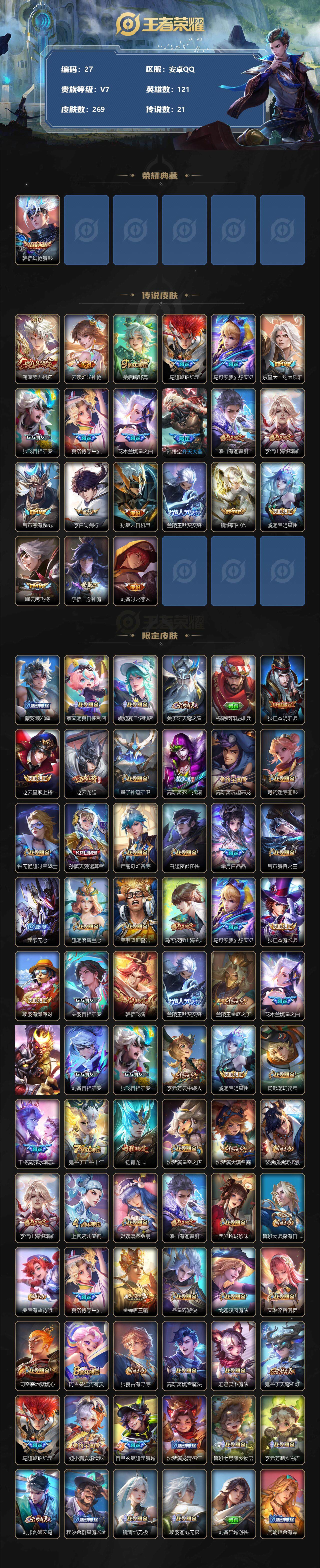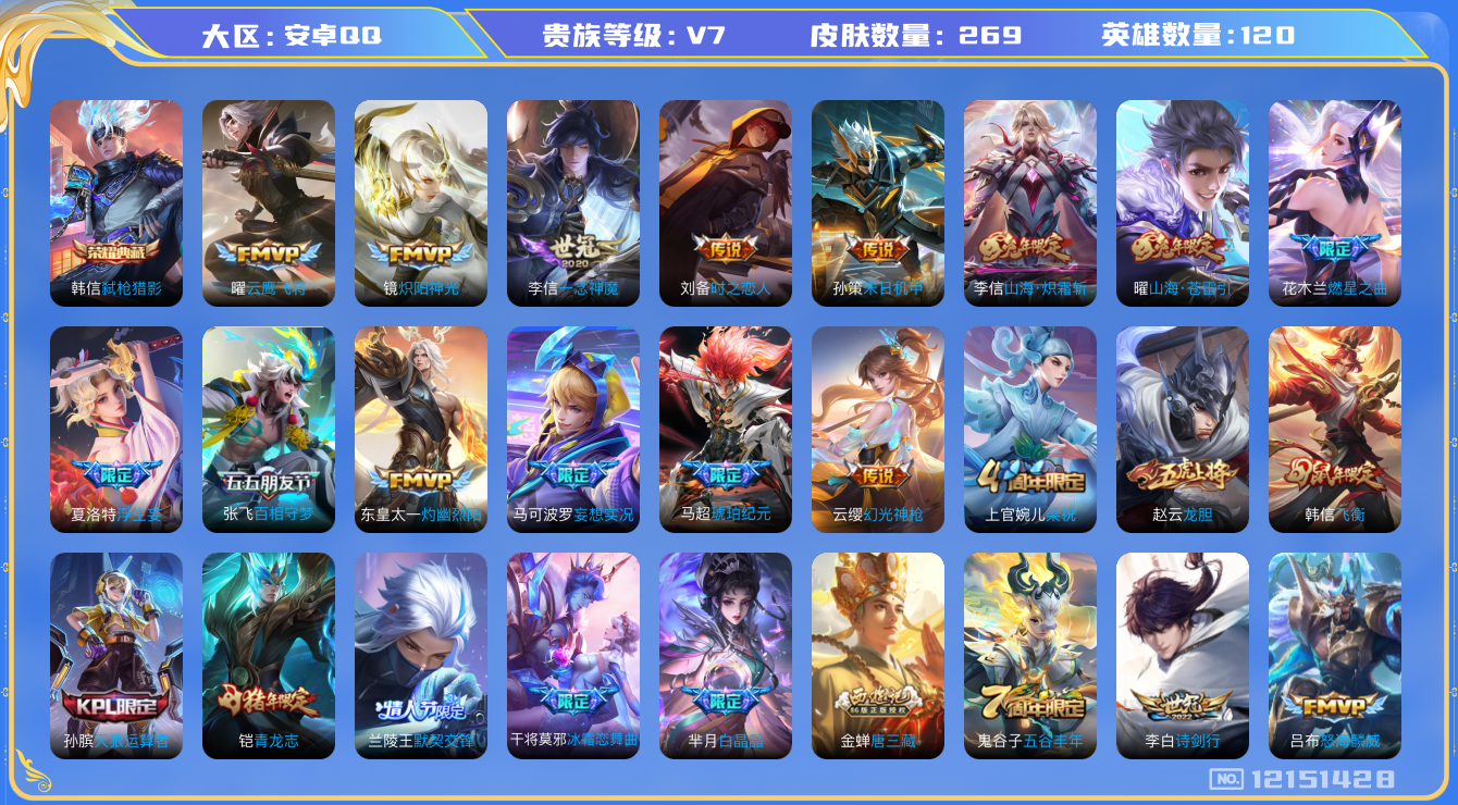 [12151428]MQ684 【商品标题】:安卓Q-V6-永恒钻石IV段位-121英雄-269皮肤-1典藏-0珍品无双-0无双-0珍品传说-21传说-78史诗