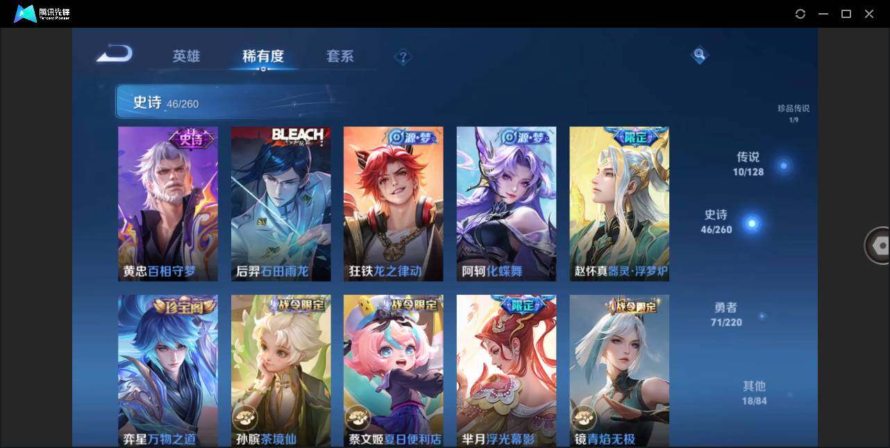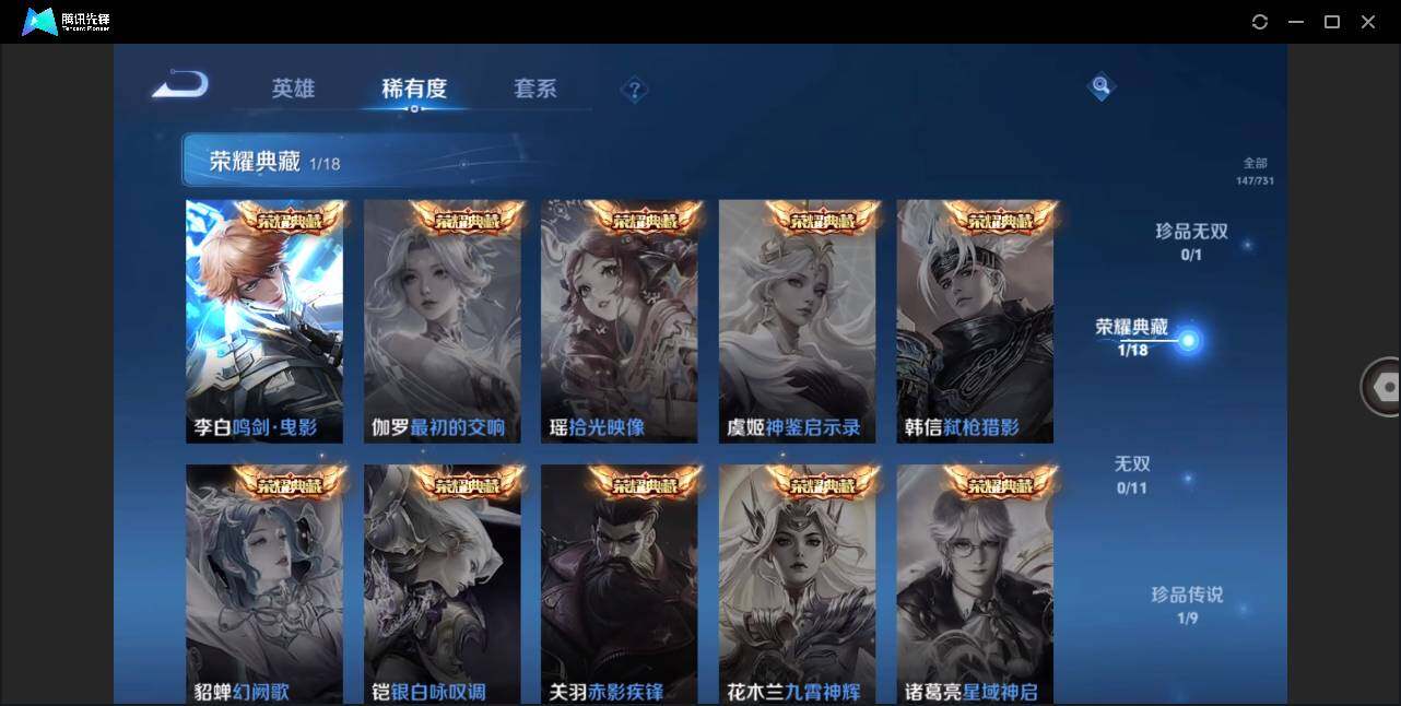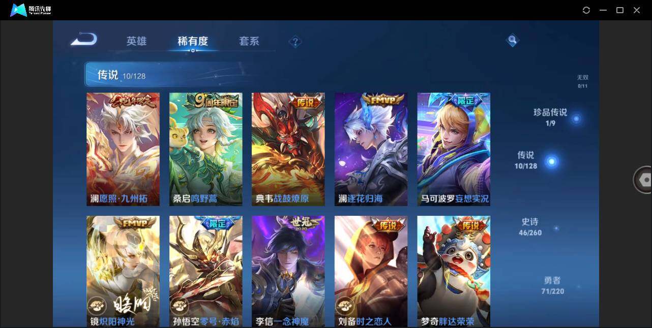 【传说皮肤】:澜愿照九州拓,桑启鸣野蒿,典韦战鼓燎原,澜逐花归海,马可波罗妄想实况,镜炽阳神光,孙悟空零号赤焰,李信一念神魔,刘备时之恋人,梦奇胖达荣荣