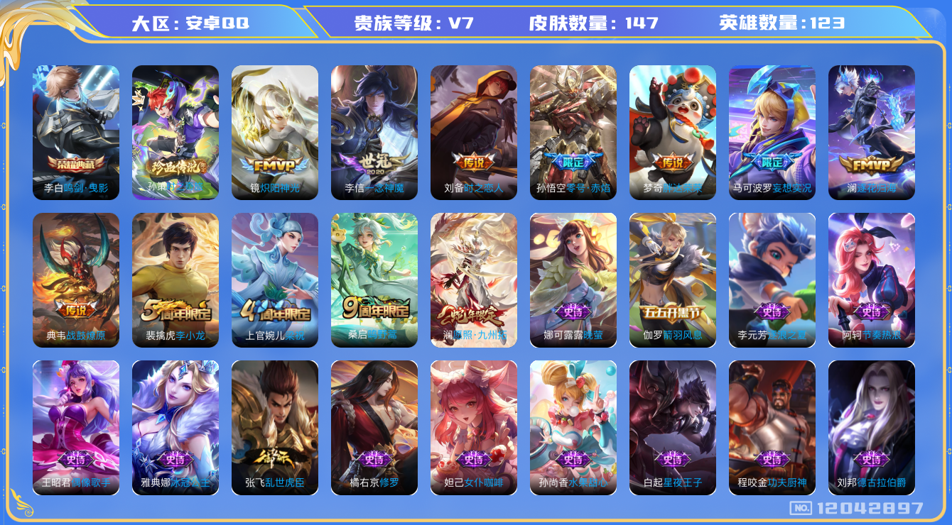 [12042897]【特价急出/详情看图】:安卓Q-V7-最强王者段位-123英雄-147皮肤-1典藏-1珍品传说-10传说-46史诗