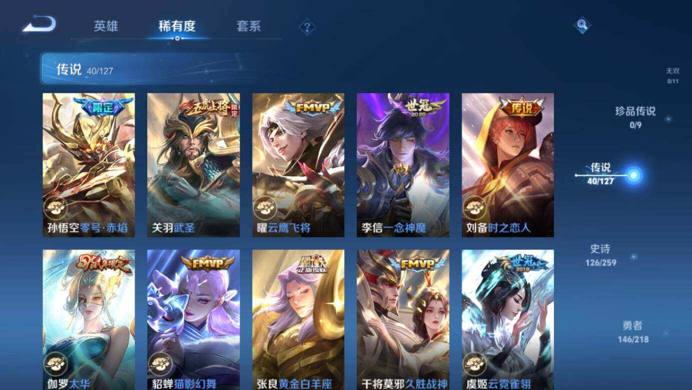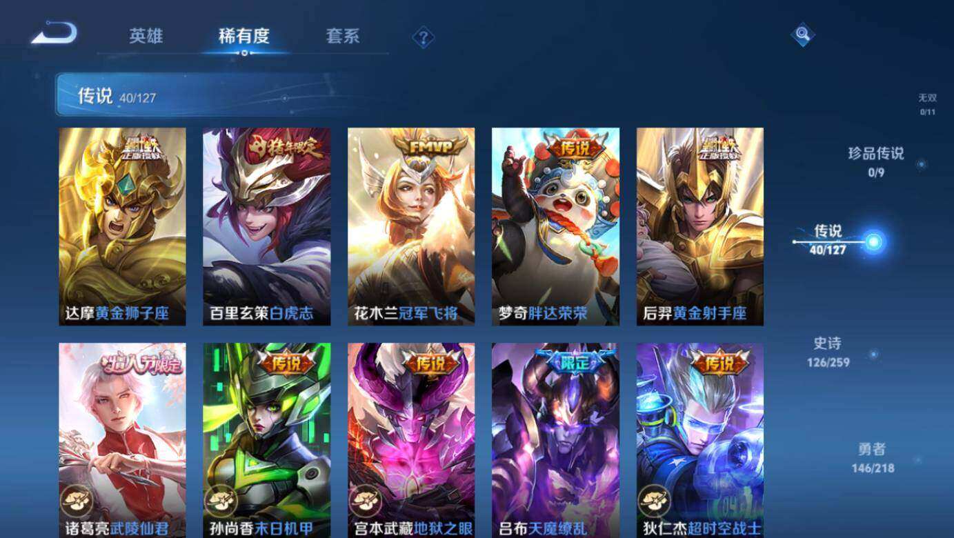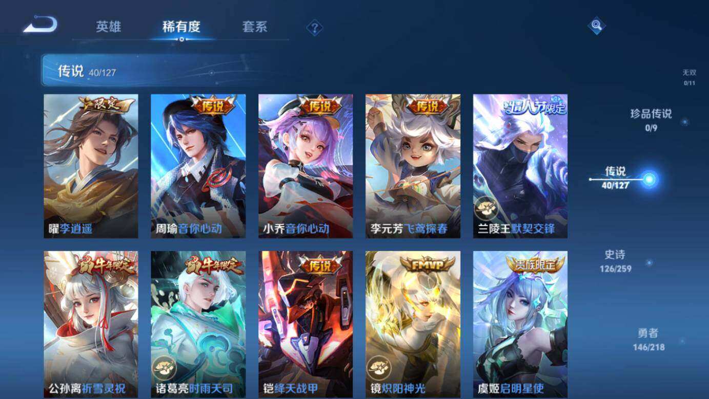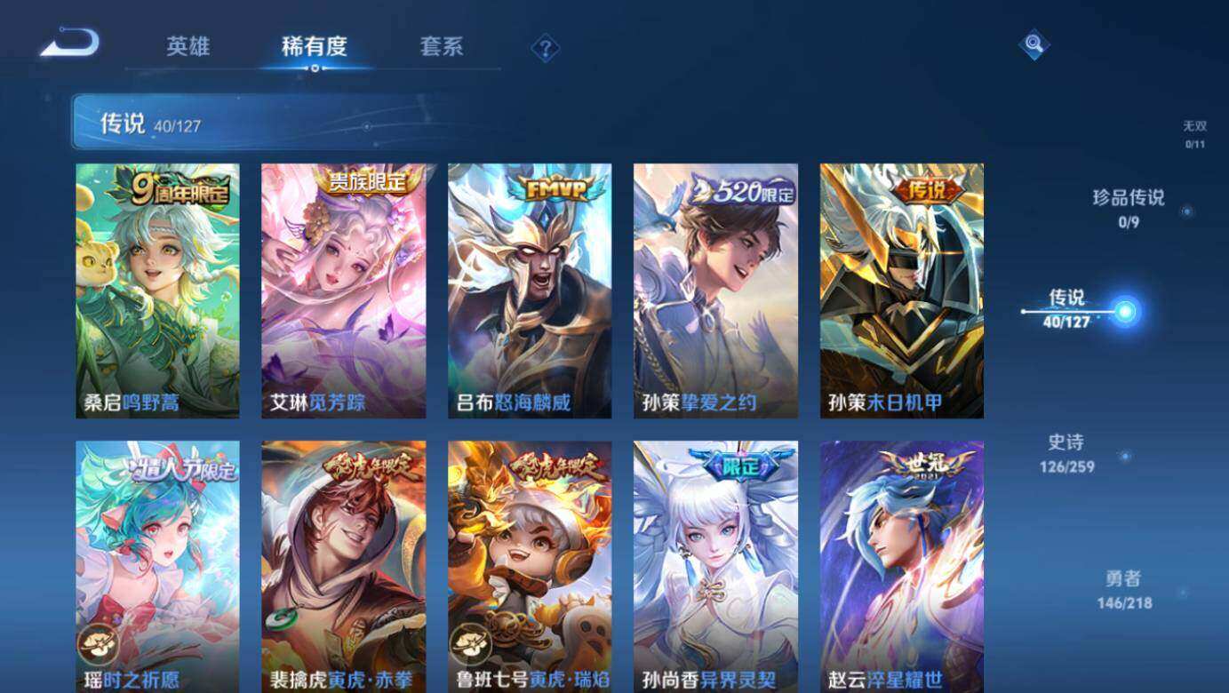 【传说皮肤】:桑启鸣野蒿,艾琳觅芳踪,吕布怒海麟威,孙策挚爱之约,孙策末日机甲,瑶时之祈愿,裴擒虎寅虎赤拳,鲁班七号寅虎瑞焰,孙尚香异界灵契,赵云淬星耀世,曜李逍遥 ,周瑜音你心动,小乔音你心动,李元芳飞鸢探春,兰陵王默契交锋,公孙离祈雪灵祝,诸葛亮时雨天司,铠绛天战甲,镜炽阳神光,虞姬启明星使,孙悟空零号赤焰,关羽武圣,曜云鹰飞将,李信一念神魔,刘备时之恋人,伽罗太华,貂蝉猫影幻舞,张良黄金白羊座,干将莫邪久胜战神,虞姬云霓雀翎,达摩黄金狮子座,百里玄策白虎志,花木兰冠军飞将,梦奇胖达荣荣,后羿黄金射手座,诸葛亮武陵仙君,孙尚香末日机甲,宫本武藏地狱之眼,吕布天魔缭乱,狄仁杰超时空战士