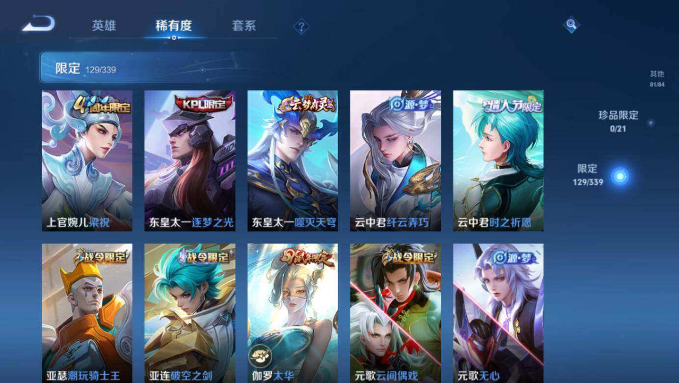 【限定皮肤】:狄仁杰阴阳师,廉颇寅虎御盾,赵云皇家上将,赵云龙胆,赵云百木心枪,墨子神迹守卫,妲己时之彼端,孙尚香蔷薇恋人,孙尚香异界灵契,鲁班七号狮舞东方,鲁班七号寅虎瑞焰,庄周玄嵩,庄周高山流水,高渐离死亡摇滚,高渐离玩趣恶龙,阿轲迷踪丽影,钟无艳超时空战士,孙膑天狼运算者,白起夜都怪侠,芈月白晶晶,芈月幻夜卜梦,吕布天魔缭乱,吕布御风骁将,周瑜赤莲之焰,元歌云间偶戏,元歌无心,夏侯惇朔风刀,夏侯惇匿光决锋者,甄姬幽恒,甄姬游园惊梦,甄姬落雪兰心,曹操天狼征服者,典韦蓝屏警告,马可波罗暗影游猎,马可波罗山海玄木吟,狄仁杰魔术师,狄仁杰万华元夜,达摩星际陆战队,达摩沙漠行僧,项羽海滩派对,项羽霸王别姬,老夫子醍醐杖,老夫子航海奇遇记,关羽武圣,程咬金演武夺筹,露娜一生所爱,刘邦夺宝奇兵,韩信傲雪梅枪,王昭君午后时光,兰陵王默契交锋,兰陵王驯魔猎人,兰陵王金庭之子,花木兰默契交锋,亚瑟潮玩骑士王,孙悟空至尊宝,孙悟空大圣娶亲,孙悟空零号赤焰,孙悟空孙行者,牛魔御旌,牛魔奔雷神使,后羿如梦令,后羿圣弓游侠,李元芳银河之约,李元芳云中旅人,虞姬霸王别姬,虞姬启明星使,钟馗神迹守卫,钟馗驱傩正仪,干将莫邪冰霜恋舞曲,干将莫邪真爱魔法,雅典娜单词大作战,雅典娜黎明之约,蔡文姬繁星吟游,太乙真人饕餮,太乙真人华丽摇滚,东皇太一逐梦之光,鬼谷子原初探秘者,鬼谷子五谷丰年,诸葛亮武陵仙君,诸葛亮时雨天司,黄忠烈魂,黄忠火炮绅士,苏烈千军破阵