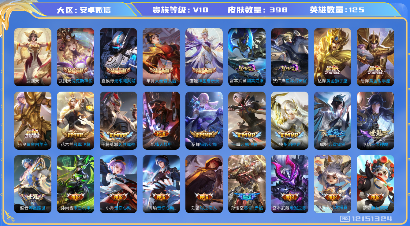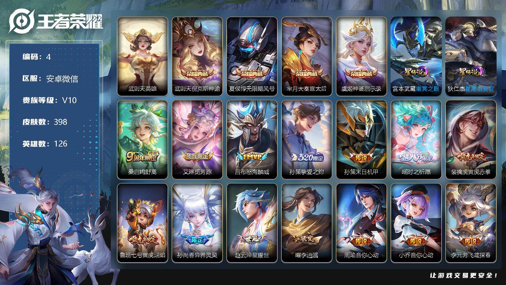 [12151324]AK742-V10-397皮肤-4典藏-40传说-126史诗 【荣耀典藏】:武则天英雄,武则天倪克斯神谕,夏侯惇无限飓风号,芈月大秦宣太后,虞姬神鉴启示录 【传说皮肤】:桑启鸣野蒿,艾琳觅芳踪,吕布怒海麟威,孙策挚爱之约,孙策末日机甲,瑶时之祈愿,裴擒虎寅虎赤拳,鲁班七号寅虎瑞焰,孙尚香异界灵契,赵云淬星耀世,曜李逍遥 ,周瑜音你心动,小乔音你心动,李元芳飞鸢探春,兰陵王默契交锋,公孙离祈雪灵祝,诸葛亮时雨天司,铠绛天战甲,镜炽阳神光,虞姬启明星使,孙悟空零号赤焰,关羽武圣,曜云鹰飞将,李信一念神魔,刘备时之恋人,伽罗太华,貂蝉猫影幻舞,张良黄金白羊座,干将莫邪久胜战神,虞姬云霓雀翎,达摩黄金狮子座,百里玄策白虎志,花木兰冠军飞将,梦奇胖达荣荣,后羿黄金射手座,诸葛亮武陵仙君,孙尚香末日机甲,宫本武藏地狱之眼,吕布天魔缭乱,狄仁杰超时空战士 【限定皮肤】:狄仁杰阴阳师,廉颇寅虎御盾,赵云皇家上将,赵云龙胆,赵云百木心枪,墨子神迹守卫,妲己时之彼端,孙尚香蔷薇恋人,孙尚香异界灵契,鲁班七号狮舞东方,鲁班七号寅虎瑞焰,庄周玄嵩,庄周高山流水,高渐离死亡摇滚,高渐离玩趣恶龙,阿轲迷踪丽影,钟无艳超时空战士,孙膑天狼运算者,白起夜都怪侠,芈月白晶晶,芈月幻夜卜梦,吕布天魔缭乱,吕布御风骁将,周瑜赤莲之焰,元歌云间偶戏,元歌无心,夏侯惇朔风刀,夏侯惇匿光决锋者,甄姬幽恒,甄姬游园惊梦,甄姬落雪兰心,曹操天狼征服者,典韦蓝屏警告,马可波罗暗影游猎,马可波罗山海玄木吟,狄仁杰魔术师,狄仁杰万华元夜,达摩星际陆战队,达摩沙漠行僧,项羽海滩派对,项羽霸王别姬,老夫子醍醐杖,老夫子航海奇遇记,关羽武圣,程咬金演武夺筹,露娜一生所爱,刘邦夺宝奇兵,韩信傲雪梅枪,王昭君午后时光,兰陵王默契交锋,兰陵王驯魔猎人,兰陵王金庭之子,花木兰默契交锋,亚瑟潮玩骑士王,孙悟空至尊宝,孙悟空大圣娶亲,孙悟空零号赤焰,孙悟空孙行者,牛魔御旌,牛魔奔雷神使,后羿如梦令,后羿圣弓游侠,李元芳银河之约,李元芳云中旅人,虞姬霸王别姬,虞姬启明星使,钟馗神迹守卫,钟馗驱傩正仪,干将莫邪冰霜恋舞曲,干将莫邪真爱魔法,雅典娜单词大作战,雅典娜黎明之约,蔡文姬繁星吟游,太乙真人饕餮,太乙真人华丽摇滚,东皇太一逐梦之光,鬼谷子原初探秘者,鬼谷子五谷丰年,诸葛亮武陵仙君,诸葛亮时雨天司,黄忠烈魂,黄忠火炮绅士,苏烈千军破阵