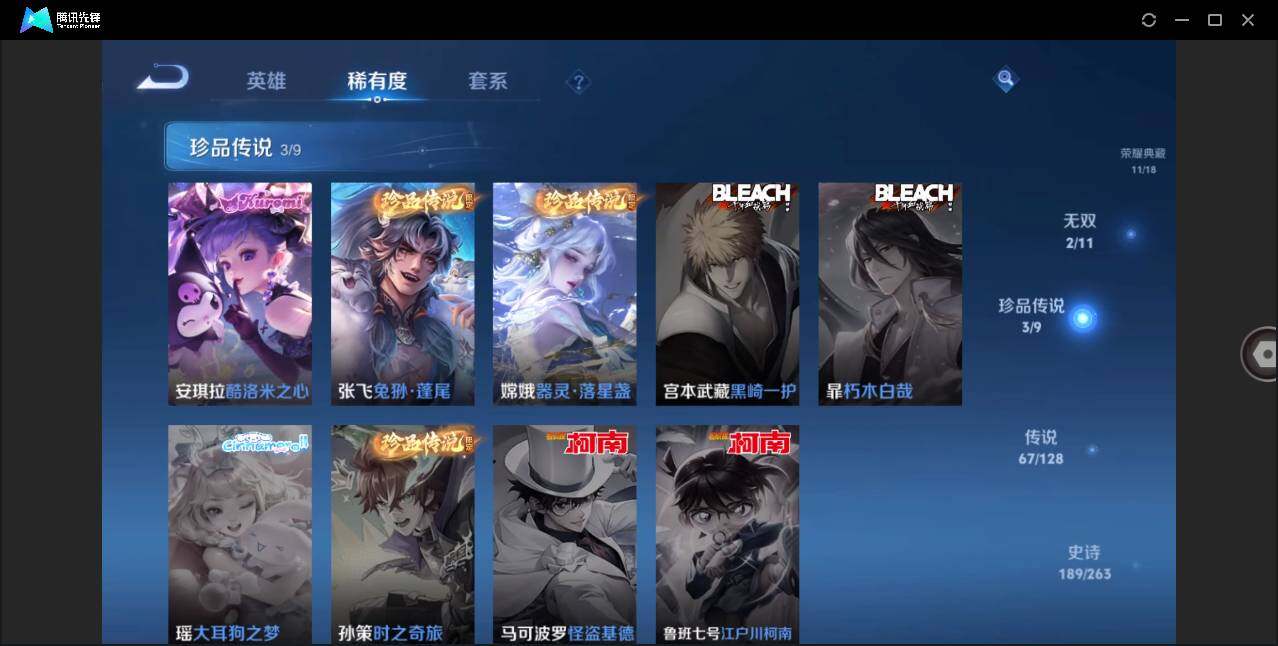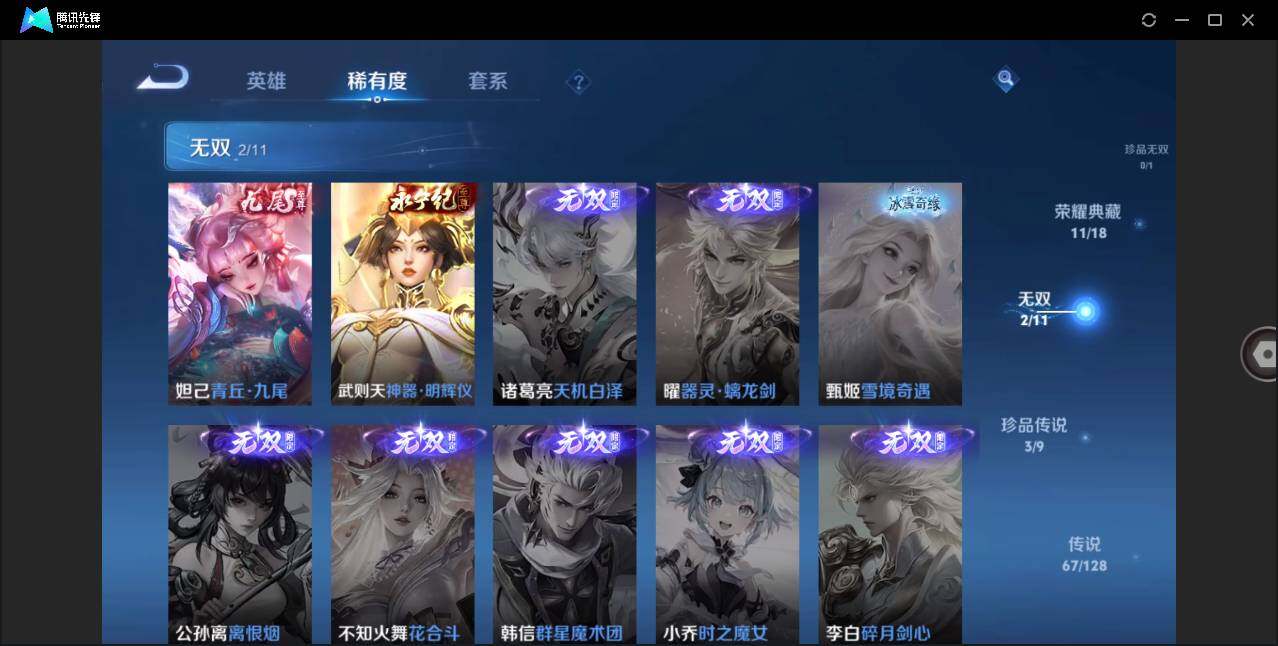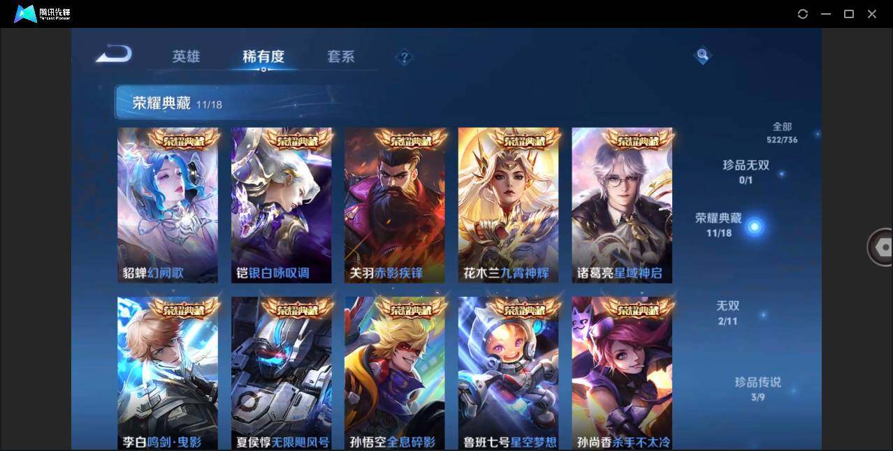 【荣耀典藏】:武则天英雄,孙悟空全息碎影,夏侯惇无限飓风号,小乔天鹅之梦,孙尚香杀手不太冷,鲁班七号星空梦想,李白鸣剑曳影,诸葛亮星域神启,花木兰九霄神辉,关羽赤影疾锋,铠银白咏叹调,貂蝉幻阙歌