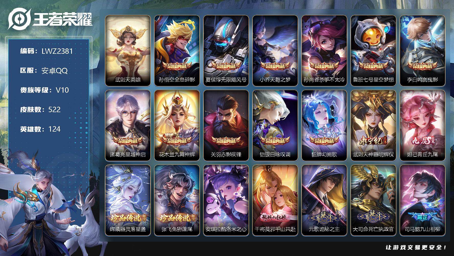 [12102089]对抗路37段/中路30段【特价急出/详情看图】:安卓Q-V10-最强王者段位-124英雄-522皮肤-11典藏-2无双-3珍品传说-67传说-188史诗 【荣耀典藏】:武则天英雄,孙悟空全息碎影,夏侯惇无限飓风号,小乔天鹅之梦,孙尚香杀手不太冷,鲁班七号星空梦想,李白鸣剑曳影,诸葛亮星域神启,花木兰九霄神辉,关羽赤影疾锋,铠银白咏叹调,貂蝉幻阙歌 【无双皮肤】:武则天神器明辉仪,妲己青丘九尾 【珍品传说】:嫦娥器灵落星盏,张飞兔狲蓬尾,安琪拉酷洛米之心 【传说皮肤】:干将莫邪千山共赴,元歌诡秘之主,大司命死亡执政官,司马懿九山相柳,司空震愿照山河定,女娲愿照千秋盛,艾琳觅芳踪,亚瑟追逃游戏,安琪拉追逃游戏,张飞百相守梦,公孙离记忆之芯,夏洛特浮生妄,干将莫邪画中仙,花木兰燃星之曲,虞姬无限倾心,项羽无限倾心,伽罗炽翼辉光,孙悟空齐天大圣,小乔山海琳琅生,曜山海苍雷引,李信山海炽霜斩,吕布怒海麟威,李白诗剑行,狄仁杰神器狴犴令,不知火舞绯月行,王昭君星穹之声,百里守约碎云,橘右京枫霜尽,娜可露露前尘镜,马可波罗深海之息,后羿无尽星芒,马超无双飞将,大乔挚爱花嫁,孙策挚爱之约,露娜启示之音,蔡文姬花朝如约,女娲补天,孙策末日机甲,孙尚香异界灵契,貂蝉遇见胡旋,赵云淬星耀世,王昭君乞巧织情,曜李逍遥 ,李元芳飞鸢探春,公孙离祈雪灵祝,诸葛亮时雨天司,铠绛天战甲,镜炽阳神光,虞姬启明星使,曜云鹰飞将,李信一念神魔,伽罗太华,貂蝉猫影幻舞,达摩黄金狮子座,百里玄策白虎志,花木兰冠军飞将,后羿黄金射手座,杨戬永曜之星,诸葛亮武陵仙君,貂蝉仲夏夜之梦,李白凤求凰,孙尚香末日机甲,宫本武藏地狱之眼,孙悟空地狱火,吕布天魔缭乱,武则天海洋之心,狄仁杰超时空战士 【限定皮肤】:白起狰,姜子牙天穹之誓,狄仁杰阴阳师,小乔纯白花嫁,虞姬凯尔特女王,小乔山海琳琅生,赵云皇家上将,赵云引擎之心,赵云龙胆,墨子神迹守卫,墨子降魔,妲己热情桑巴,妲己时之彼端,妲己时之奇旅,嬴政优雅恋人,嬴政白昼王子,孙尚香蔷薇恋人,孙尚香异界灵契,鲁班七号狮舞东方,庄周蜃楼王,庄周云端筑梦师,庄周玄嵩,庄周高山流水,高渐离死亡摇滚,阿轲迷踪丽影,钟无艳王者之锤,钟无艳超时空战士,孙膑妖精王,孙膑天狼运算者,扁鹊炼金王,扁鹊奇幻香踪,白起夜都怪侠,芈月重明,芈月白晶晶,芈月幻夜卜梦,吕布天魔缭乱,吕布猎兽之王,吕