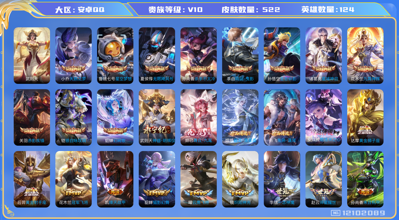 - [12277574]V10 7典藏 34传说 125英雄 419皮肤 可修改实名 女号 优质装备:天鹅之梦(小乔典藏),星空梦想(太空人),鸣剑·曳影,全息碎影(猴子典藏),星域神启(倪克斯贼亮),银白咏叹调(倪克斯侍卫),弑枪猎影(韩信典藏),黄金狮子座,黄金射手座,冠军飞将,云鹰飞将(小将军),绛天战甲(鸡嘴战神),猫影幻舞,久胜战神,炽阳神光,一念神魔,末日机甲-孙尚香(绿蚂蚱),地狱火,仲夏夜之梦(大飞蛾),音你心动-小乔,零号·赤焰,地狱之眼,音你心动-周瑜,胖达荣荣,时之恋人-刘备(电焊工),游龙清影(小青龙),淬星耀世,超时空战士-狄仁杰,遇见胡旋,妄想实况,鲁班七号-时之奇旅,艾琳觅芳踪,涂山容容 传说皮:乘龙·问璇玑(孙尚香年限) 珍宝阁皮:妄想食味,优雅恋人,女武神 限定皮:逐霄战戟,鸣野蒿,至尊宝,太华(伽罗年限),异界灵契(白毛香),傲雪梅枪,寅虎·展翼(孙膑年限),神威(电光马子),飞衡(韩信年限),高山流水,诗剑行,齐天大圣,五谷丰年,冰锋战神,游园惊梦,梁祝,御风骁将(吕布年限),岱宗(典韦年限),天狼溯光者,李小龙,逐梦之影,朱雀志(守约年限),如梦令-后羿,孙行者,猪悟能,一生所爱,大圣娶亲,引擎之心,冰霜恋舞曲,乒乒小将,蜜橘之夏,美猴王,匿光追影者,寅虎·御盾(廉颇年限),寅虎·瑞焰(虎皮蛋子),寅虎·心曲(虎婆),寅虎·赤拳(老虎年限),神器·万象笔 史诗皮:化蝶舞,谪仙醉月,龙之律动,石田雨龙,茶境仙,怒海争锋,破空之剑,战舞者,琥珀纪元伽罗,蔬乡物语(鲁班七号),紫霞仙子,苍穹之光,电玩小子(小书包),白龙吟,黄金分割率,特工魅影,千年之狐,永昼,江河有灵,魅语,百解令(蒙犽),高渐离燃音魔法,无限星赏官,冰冠公主,青蛇,偶像歌手,白蛇,晚萤,电玩·爆裂旋风,暗夜猫娘,龙骑士(小龙虾),末日机甲-吕布,猫狗日记-孙策,猫狗日记-大乔,乱世虎臣,节奏热浪,修罗,女仆咖啡,摇滚巨星,水果甜心,绅士熊喵,天才门将,星夜王子,心灵骇客,时之奇旅-安琪拉,功夫厨神,德古拉伯爵,暗隐猎兽者,幽灵船长,鬼剑武藏,暗渊魔法,心灵战警,乐园奇幻夜,天秀·启明,舞动绿茵,地狱岩魂,诗语江南,纤云弄巧,拒霜思,缤纷独角兽,乘风破浪,逐浪之夏,龙鼓争鸣,月团寄思,水晶猎龙者,曙光守护者,箭羽风息,金属风暴,圣诞狂欢,圣诞恋歌,鹰眼统帅,暗夜贵公子,魅力维加斯,