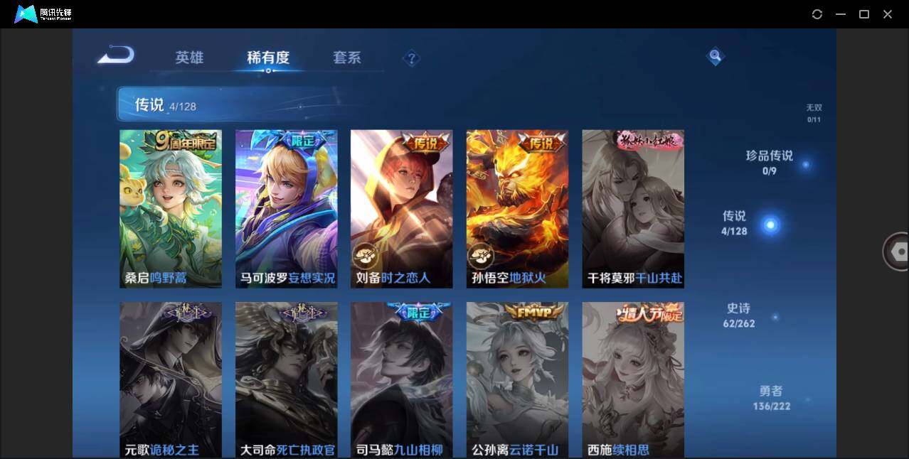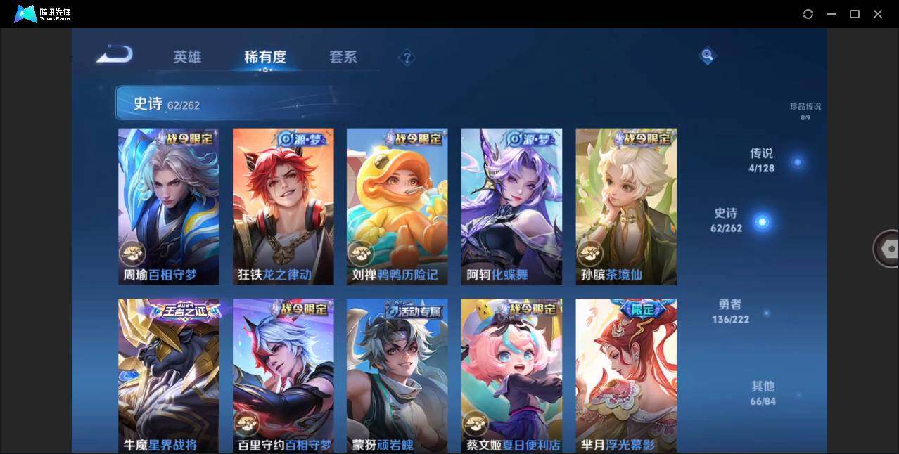 - PX_2069687-32 安卓QQ/尊贵铂金/176皮肤/121英雄/0典藏/0珍品无双/0无双/0珍品传说/11传说/52史诗/7稀有英雄 【11 传说皮肤】云鹰飞将 曜,诗剑行 李白,记忆之芯 公孙离,时雨天司 诸葛亮,炽阳神光 镜,冠军飞将 花木兰,愿照·众生和 妲己,愿照·福禄聚 蔡文姬,愿照·岁时盈 虞姬,愿照·千秋盛 女娲,鸣野蒿 桑启, 【52 史诗皮肤】末日机甲 吕布,紫霞仙子