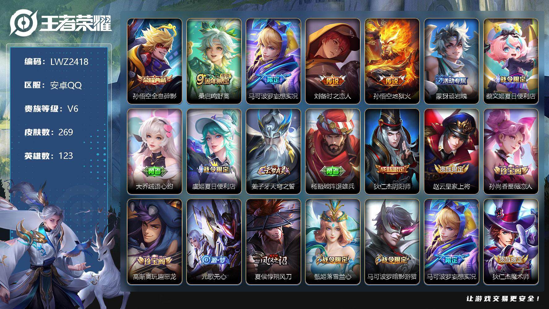 [12125481]【特价急出/详情看图】:安卓Q-V6-至尊星耀III段位-123英雄-269皮肤-1典藏-4传说-62史诗 【荣耀典藏】:孙悟空全息碎影 【传说皮肤】:桑启鸣野蒿,马可波罗妄想实况,刘备时之恋人,孙悟空地狱火 【限定皮肤】:蒙犽顽岩魄,蔡文姬夏日便利店,大乔绒语心约,虞姬夏日便利店,姜子牙天穹之誓,杨戬破阵退雄兵,狄仁杰阴阳师,赵云皇家上将,孙尚香蔷薇恋人,高渐离玩趣恶龙,元歌无心,夏侯惇朔风刀,甄姬落雪兰心,马可波罗暗影游猎,马可波罗妄想实况,狄仁杰魔术师,狄仁杰万华元夜,达摩沙漠行僧,项羽海滩派对,老夫子醍醐杖,程咬金演武夺筹,兰陵王金庭之子,孙悟空孙行者,牛魔御旌,李元芳云中旅人,钟馗神迹守卫,钟馗驱傩正仪,干将莫邪胡桃夹子,鬼谷子原初探秘者,鬼谷子五谷丰年,铠青龙志,苏烈千军破阵,百里玄策原初追逐者,沈梦溪大漠名商,明世隐疑决卦,裴擒虎李小龙,裴擒虎擒涛扼浪,狂铁御狮,米莱狄御霄,云中君纤云弄巧,盾山御銮,猪八戒西部大镖客,上官婉儿梁祝,嫦娥拒霜思,鲁班大师探海日志,桑启海盐诗旅,艾琳流音漫舞,司空震地狱燃心,阿古朵江河有灵,张良古海寻踪,蒙犽百解令,蒙恬荣光圣徽,鬼谷子天穹祈灯,沈梦溪龙舞盛年,鲁班七号蔬乡物语,李元芳蔬乡物语,刘邦剑破天穹,程咬金群星魔术团,镜青焰无极,项羽苍威无极,海诺心动手记,刘备异域游侠,芈月浮光幕影,周瑜熔金海岸 【年限皮肤】:铠青龙志,马超神威 【赛季限定】:夏侯惇朔风刀,狄仁杰万华元夜,达摩沙漠行僧,老夫子醍醐杖,程咬金演武夺筹,兰陵王金庭之子,张良古海寻踪,牛魔御旌,李元芳云中旅人,钟馗驱傩正仪,鬼谷子原初探秘者,苏烈千军破阵,百里玄策原初追逐者,沈梦溪大漠名商,明世隐疑决卦,裴擒虎擒涛扼浪,狂铁御狮,米莱狄御霄,盾山御銮,鲁班大师探海日志,桑启海盐诗旅,鬼谷子天穹祈灯,蒙恬荣光圣徽,刘邦剑破天穹,姜子牙天穹之誓 【战令限定】:蔡文姬夏日便利店,虞姬夏日便利店,甄姬落雪兰心,马可波罗暗影游猎,艾琳流音漫舞,钟馗神迹守卫,猪八戒西部大镖客,司空震地狱燃心,鲁班七号蔬乡物语,李元芳蔬乡物语,镜青焰无极,项羽苍威无极 【史诗皮肤】:赵云皇家上将,赵云未来纪元,甄姬冰雪圆舞曲,王昭君偶像歌手,狄仁杰魔术师,宫本武藏鬼剑武藏,孙尚香蔷薇恋人,孙尚香水果甜心,墨子金属风暴,曹操幽灵船长,李白千年之狐,吕布末日机甲,张飞乱世虎臣,花木兰