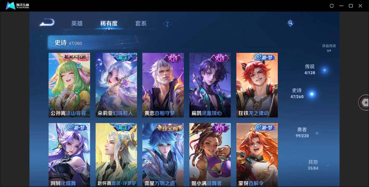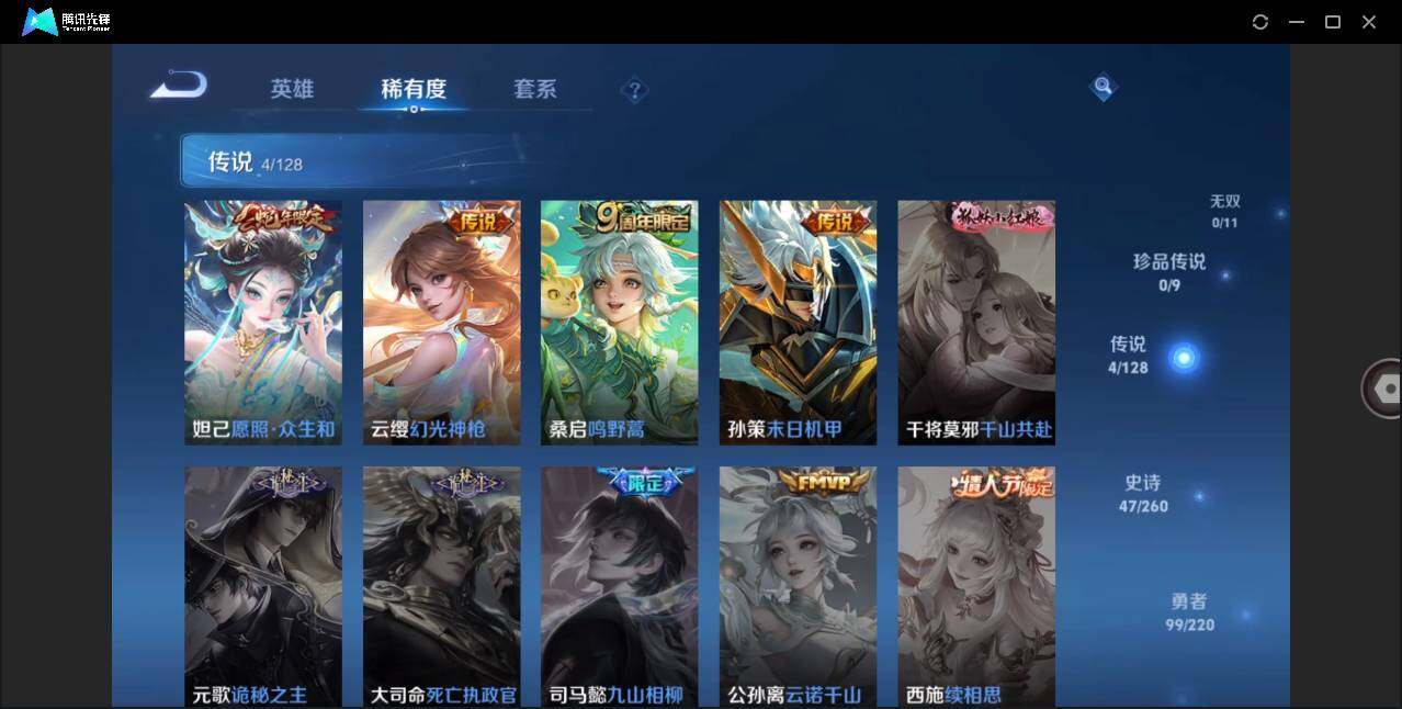 - [12203138]V7 1典藏 11传说 125英雄 229皮肤 可修改实名 优质装备:弑枪猎影(韩信典藏),云鹰飞将(小将军),猫影幻舞,久胜战神,零号·赤焰,音你心动-周瑜,李逍遥,澜逐花归海,涂山容容 珍宝阁皮:女武神,玩趣恶龙 限定皮:至尊宝,白虎志(电光耗子),太华(伽罗年限),梅西,傲雪梅枪,魔法小厨娘,时雨天司(水龙头),神威(电光马子),遇见飞天,高山流水,五谷丰年,游园惊梦,梁祝,御风骁将(吕布年限),天狼绘梦者,李小龙,朱雀志(守约年限),孙行者,大圣娶亲,寅虎·心曲(虎婆),寅虎·赤拳(老虎年限) 史诗皮:灵蛊蚀心,百相守梦-黄忠,织梦人,遇见神鹿,电玩小子(小书包),白龙吟,永昼,江河有灵,魅语,百解令(蒙犽),蒙恬荣光圣徽,无限星赏官,冰冠公主,猫狗日记-孙策,猫狗日记-大乔,节奏热浪,修罗,水果甜心,星夜王子,时之奇旅-安琪拉,功夫厨神,德古拉伯爵,暗隐猎兽者,鬼剑武藏,心灵战警,纤云弄巧,繁星吟游(呼啦呼啦),缤纷独角兽,乘风破浪,逐浪之夏,龙鼓争鸣,水晶猎龙者,金属风暴,圣诞狂欢,圣诞恋歌,鹰眼统帅,无心,未来纪元-赵云