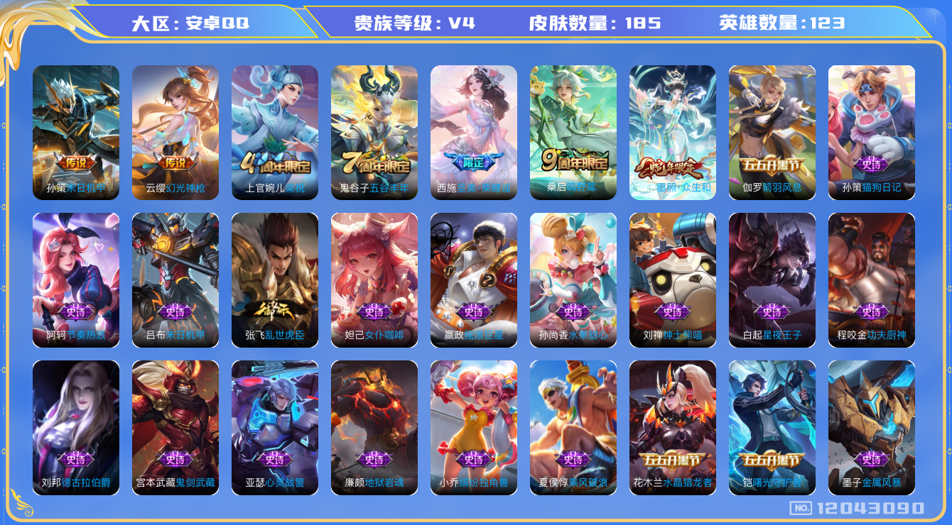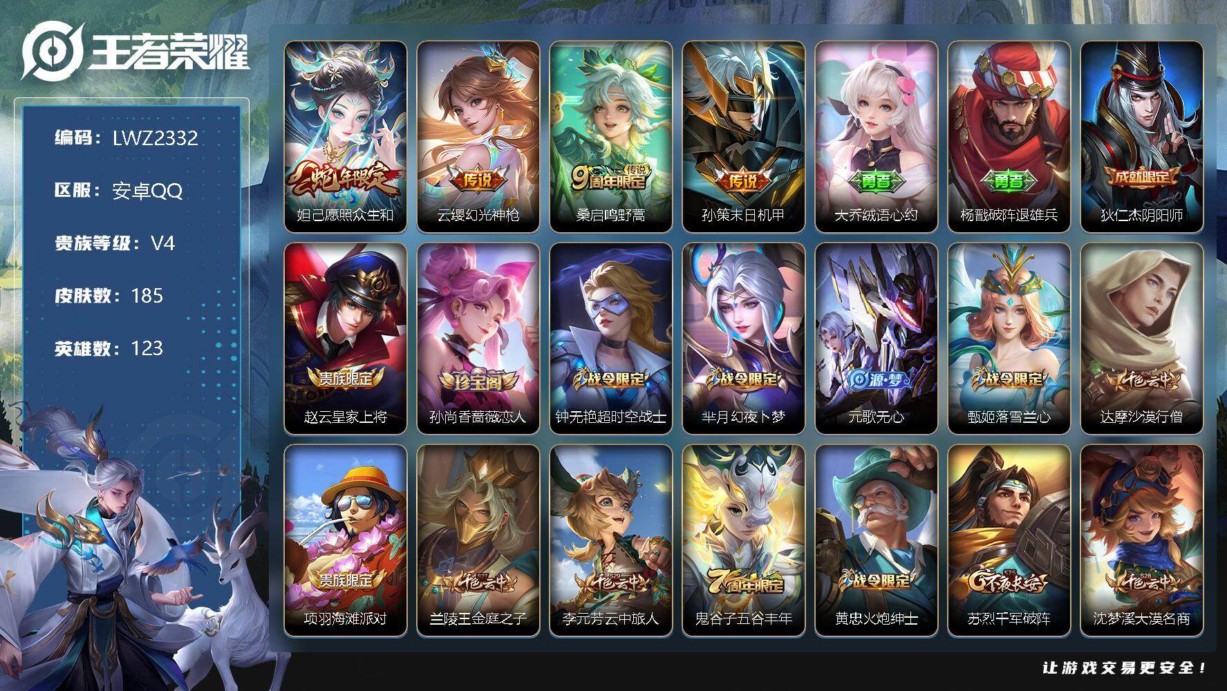 [12043090]【特价急出/详情看图】:安卓Q-V4-最强王者段位-123英雄-185皮肤-4传说-47史诗