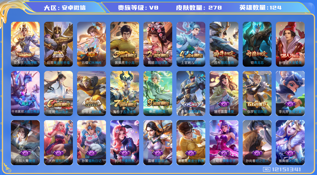 - [11819082]V10 16典藏 6无双 3珍品传说 93传说 126英雄 634皮肤 典藏英雄武则天 可修改实名 优质装备:天鹅之梦(小乔典藏),星空梦想(太空人),倪克斯神谕(宇宙婆娘),无限飓风号(高达),活力突击,杀手不太冷,大秦宣太后,鸣剑·曳影,全息碎影(猴子典藏),星域神启(倪克斯贼亮),九霄神辉(木兰典藏),赤影疾锋,银白咏叹调(倪克斯侍卫),幻阙歌(貂蝉典藏),弑枪猎影(韩信典藏),真我赫兹(瑶)(瑶无双),神器·明辉仪,青丘·九尾(妲己无双),碎月剑心(李白无双),花合斗,离恨烟(公孙离无双),最初的交响(伽罗典藏),江户川柯南,怪盗基德,黄金狮子座,黄金射手座,冠军飞将,云鹰飞将(小将军),绛天战甲(鸡嘴战神),黄金白羊座,猫影幻舞,久胜战神,炽阳神光,一念神魔,云霓雀翎,末日机甲-孙尚香(绿蚂蚱),地狱火,仲夏夜之梦(大飞蛾),音你心动-小乔,零号·赤焰,海洋之心,地狱之眼,飞鸢探春,音你心动-周瑜,胖达荣荣,李逍遥,乞巧织情,时之恋人-刘备(电焊工),游龙清影(小青龙),淬星耀世,超时空战士-狄仁杰,遇见胡旋,末日机甲-孙策,花朝如约(花篮子),挚爱之约,挚爱花嫁,无双飞将,音你闪耀(rap皮),碎云,天秀幻梦,神器·狴犴令,神器·明辉仪,山海·炽霜斩(李信年限),山海·琳琅生(小乔年限),山海·苍雷引(电光曜子),炽翼辉光(娃娃菜牛角包),燃星之曲,画中仙,浮生妄,记忆之芯(机甲兔),青丘·九尾,百相守梦(张飞),追逃游戏(亚瑟),追逃游戏(安琪拉),电玩·雷克斯,鹤羽星尊,妄想实况,惊梅引,遇见神鼓,大乔-时之奇旅,小动物乐团,霜月吟,澜逐花归海,艾琳觅芳踪,牧神诗旅,玄雷天君 珍品传说:时之奇旅-孙策 传说皮:典韦战鼓燎原,落雪白狼,铠冥王哈迪斯 珍宝阁皮:妄想食味,胡桃夹子,蔷薇恋人,玩趣恶龙 限定皮:逐霄战戟,映山客,陌上桑,鸣野蒿,夏侯惇霜北刀,至尊宝,白虎志(电光耗子),凤求凰(白切鸡),凤凰于飞,太华(伽罗年限),梅西,武陵仙君(小桃花),异界灵契(白毛香),傲雪梅枪,补天,寅虎·展翼(孙膑年限),前尘镜,星穹之声,绯月行,时之彼端,白鹤梁神女,魔法小厨娘,白晶晶,时雨天司(水龙头),神威(电光马子),飞衡(韩信年限),玄嵩(庄周年限),山海·碧波行(瑶年限),无限倾心-项羽,瑞麟志(木兰年限),至美·乘鲤谣,遇见飞天,高山流水,诗剑行