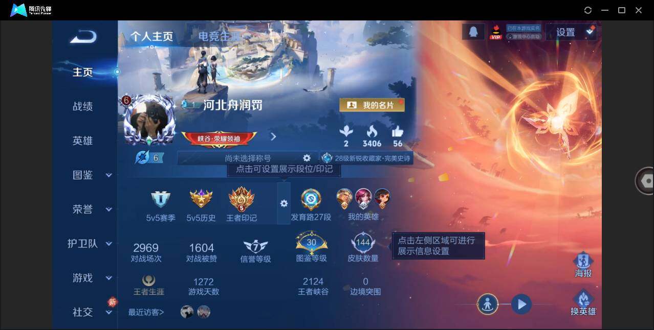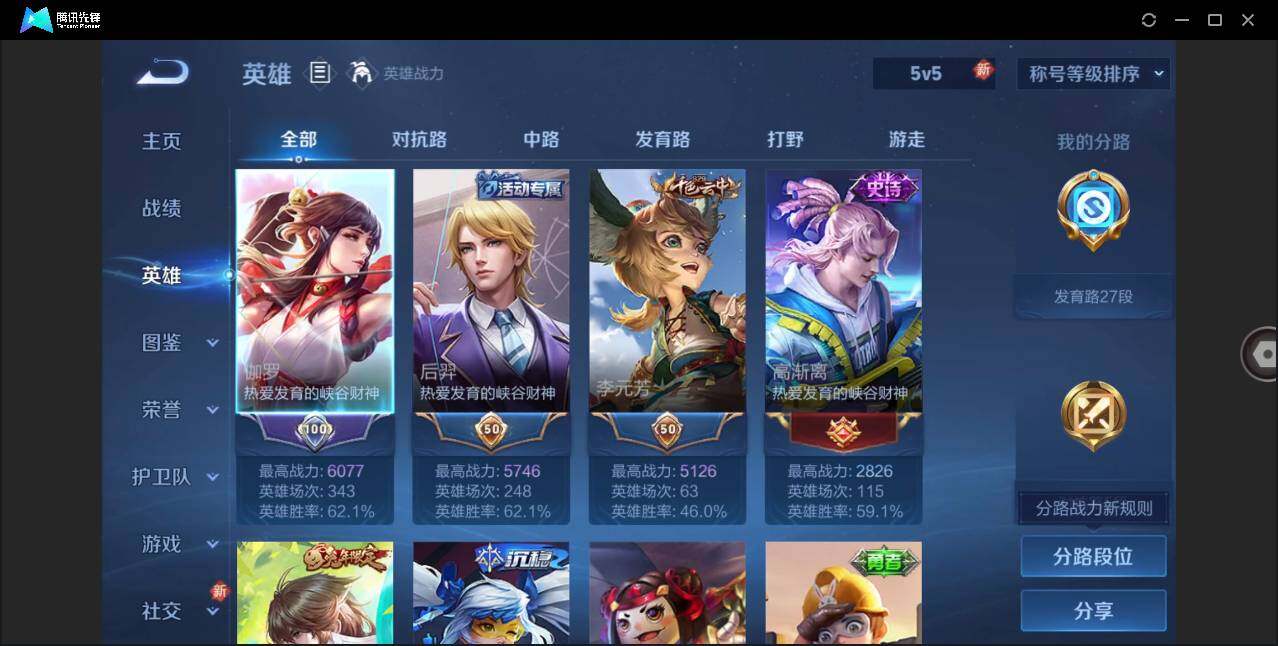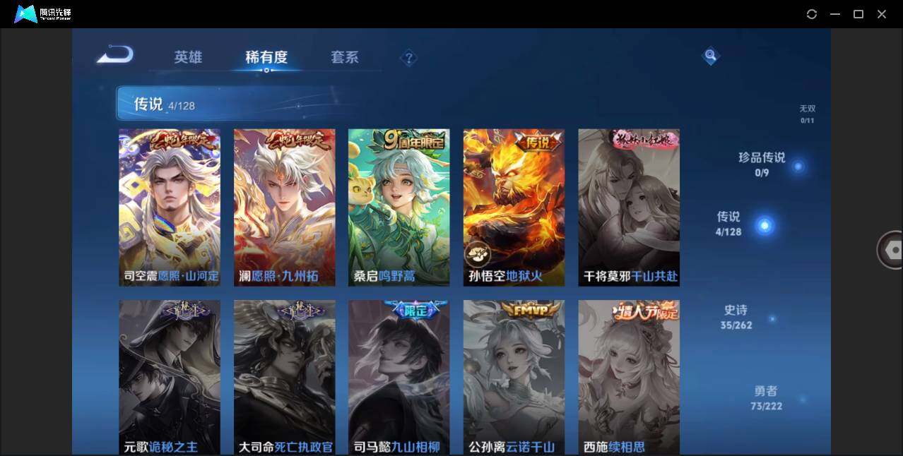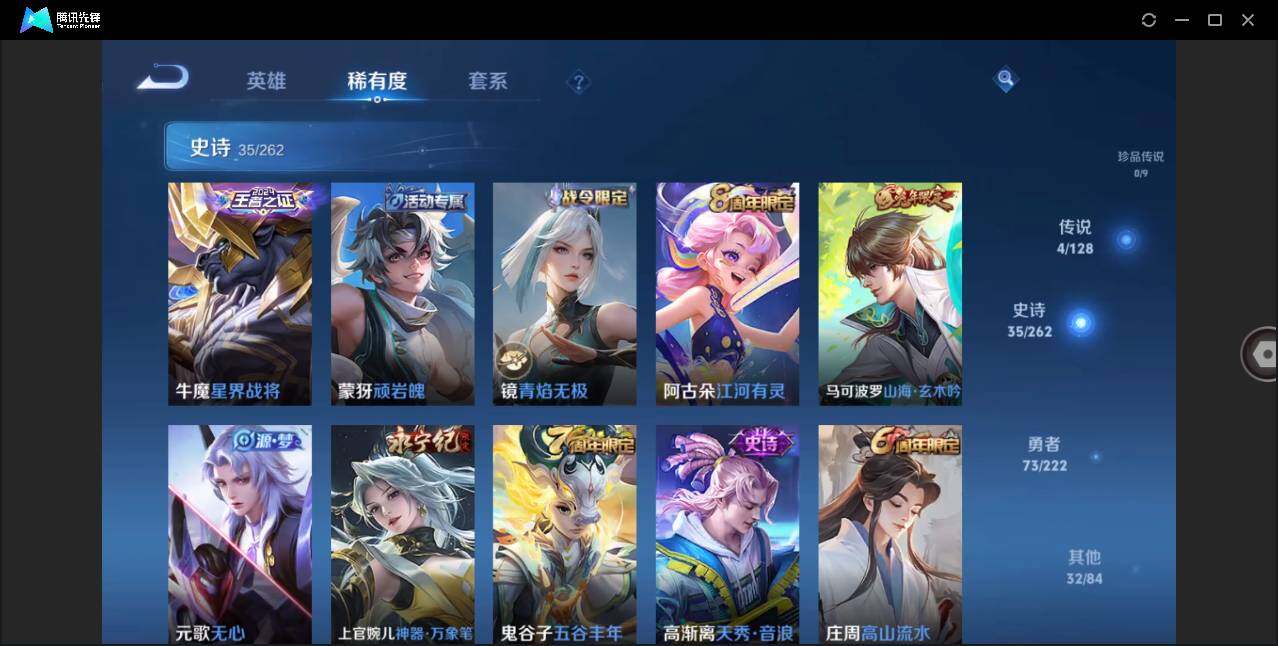 - PX_2084803-贵族等级: V9 英雄数: 125 皮肤数: 303 荣耀水晶: 武则天,活力突击,杀手不太冷 星传说: 幻海之心 传说皮: 黄金射手座,冠军飞将,久胜战神,炽阳神光,海洋之心,地狱之眼,淬星耀世,末日机甲-孙策,碎云,山海·炽霜斩,山海·苍雷引,澜逐花归海,幻光神枪 限定皮: 遇见飞天,李小龙,游园惊梦,梁祝,云端筑梦师,白鹤梁神女,天狼溯光者,神威,乒乒小将,太华,冰霜恋