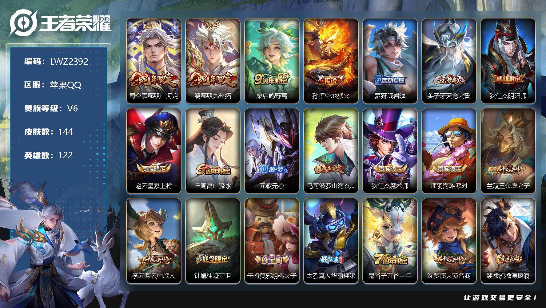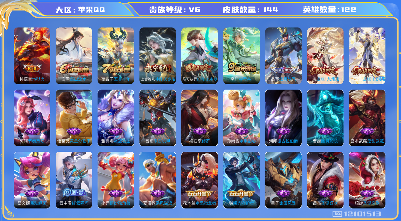 [12101513]【特价急出/详情看图】:苹果Q-V6-尊贵铂金I段位-122英雄-144皮肤-4传说-35史诗