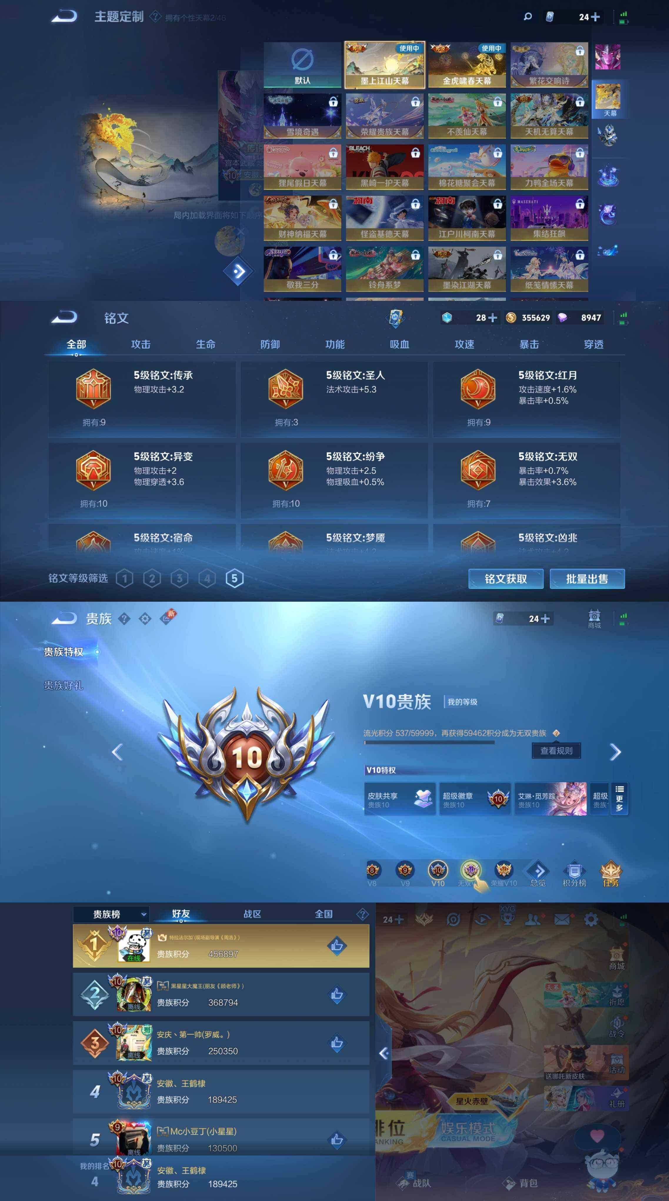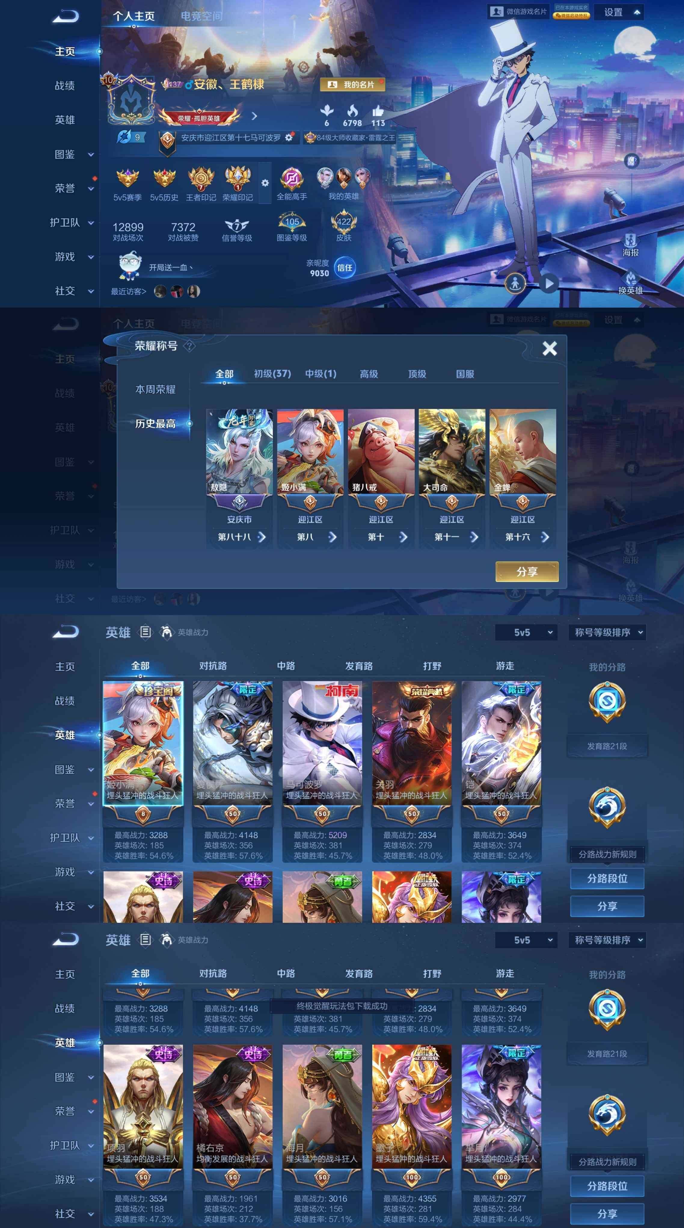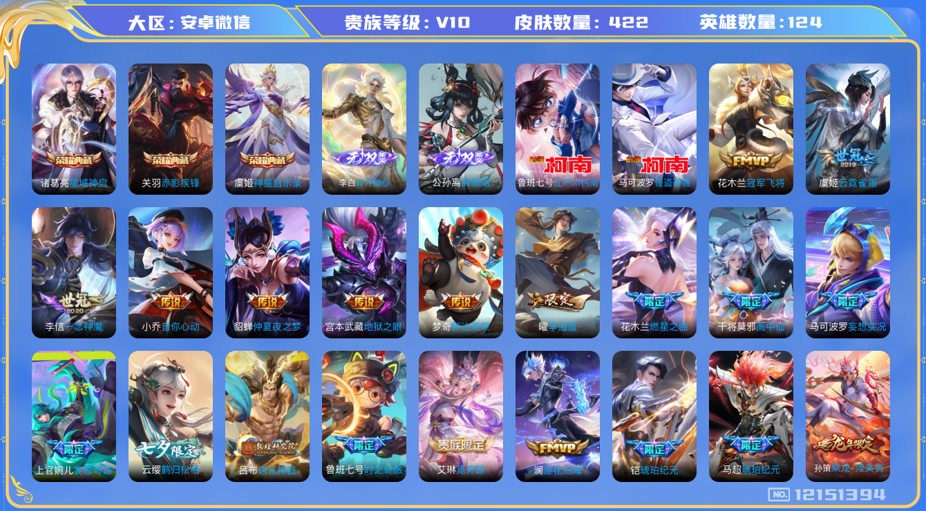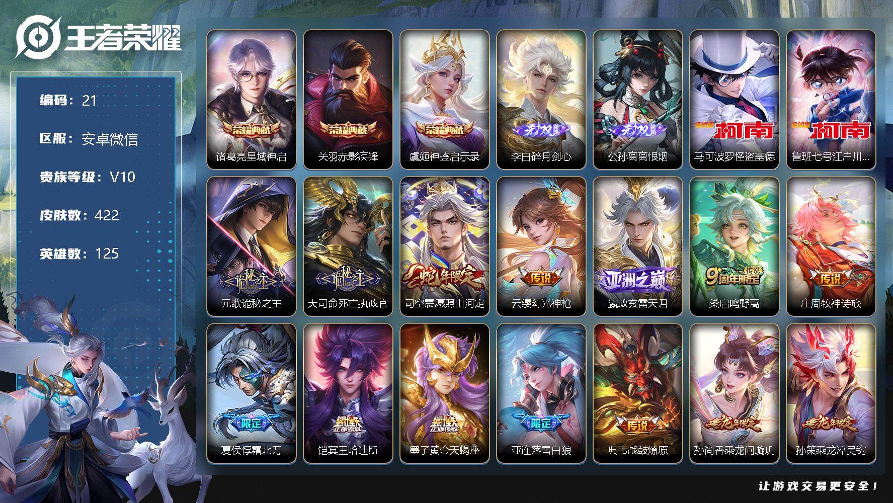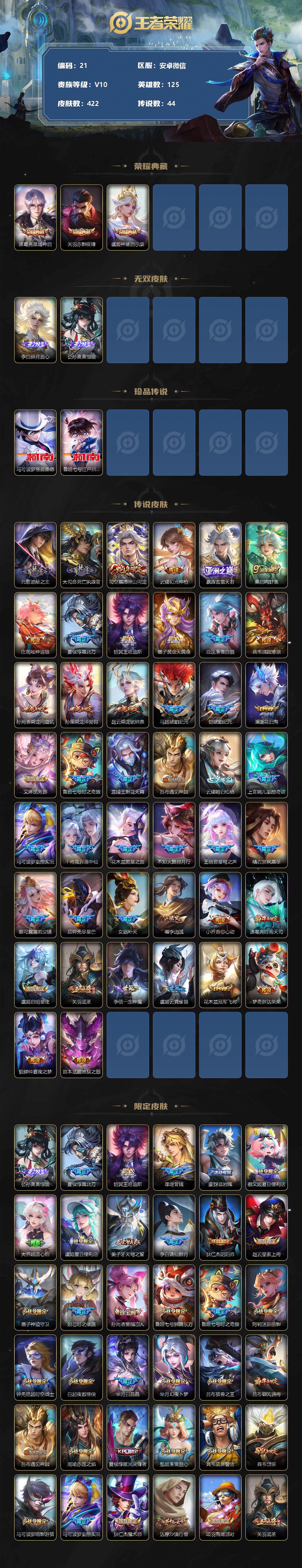 - [11497768]V8 1典藏 2珍品传说 14传说 123英雄 278皮肤 可修改实名 荣耀水晶:鸣剑·曳影 珍品传说:怪盗基德,时之奇旅-孙策 传说皮:幻光神枪,黄金狮子座,黄金白羊座,一念神魔,云鹰飞将(小将军),无双飞将,时之恋人-刘备(电焊工),挚爱之约 珍宝阁皮:妄想食味,优雅恋人,玩趣恶龙 限定皮:愿照·九州拓(澜年限),愿照·山河定(司空震年限),愿照·千秋盛(女娲年限),逐霄战戟,白虎志(电光耗子),武陵仙君(小桃花),傲雪梅枪,神威(电光马子),飞衡(韩信年限),高山流水,五谷丰年,冰锋战神,李小龙,孙行者,猪悟能,大圣娶亲,云端筑梦师 史诗皮:茶境仙,苍鳞隐世,器灵·浮梦炉,百相守梦-百里守约,化蝶舞,遇见神鹿,紫霞仙子,苍穹之光,电玩小子(小书包),白龙吟,黄金分割率,特工魅影,江河有灵,百解令(蒙犽),蒙恬荣光圣徽,冰冠公主,偶像歌手,电玩·爆裂旋风,百相守梦(关羽),龙骑士(小龙虾),末日机甲-吕布,猫狗日记-孙策,猫狗日记-大乔,节奏热浪,修罗,女仆咖啡,摇滚巨星,水果甜心,天才门将,心灵骇客,时之奇旅-安琪拉,功夫厨神,德古拉伯爵,暗隐猎兽者,幽灵船长,鬼剑武藏,心灵战警,乐园奇幻夜,天秀·启明,舞动绿茵,地狱岩魂,纤云弄巧,拒霜思,缤纷独角兽,乘风破浪,逐浪之夏,月团寄思,水晶猎龙者,曙光守护者,金属风暴,原初追逐者,圣诞狂欢,圣诞恋歌,鹰眼统帅,魅力维加斯,黎明之约,赏金猎手,无心,未来纪元-赵云