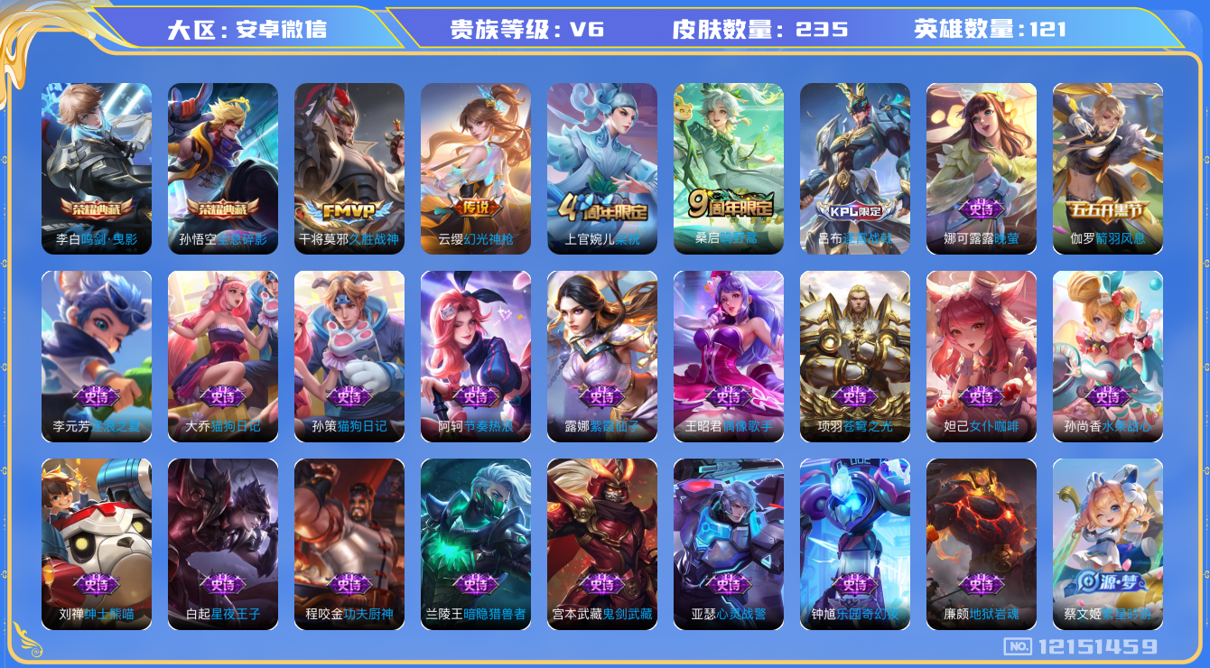 [12151459]【商品标题】:AK299-安卓WX-V6-最强王者段位-122英雄-235皮肤-2典藏-0珍品无双-0无双-0珍品传说-3传说-56史诗