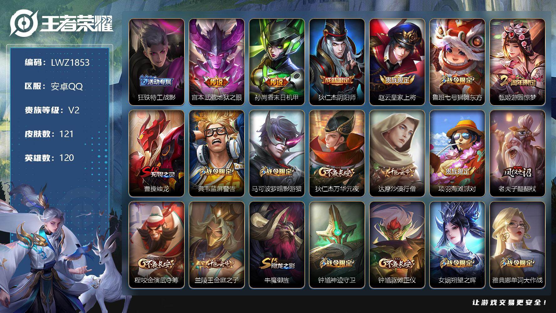 [12043837]【暑期末清货/特价急出/永久包赔】:安卓Q-V2-尊贵铂金IV段位-120英雄-121皮肤-2传说-22史诗 【内测皮肤】:狂铁特工战影 【传说皮肤】:宫本武藏地狱之眼,孙尚香末日机甲 【限定皮肤】:狄仁杰阴阳师,赵云皇家上将,鲁班七号狮舞东方,甄姬游园惊梦,曹操烛龙,典韦蓝屏警告,马可波罗暗影游猎,狄仁杰万华元夜,达摩沙漠行僧,项羽海滩派对,老夫子醍醐杖,程咬金演武夺筹,兰陵王金庭之子,牛魔御旌,钟馗神迹守卫,钟馗驱傩正仪,女娲朔望之晖,雅典娜单词大作战,太乙真人饕餮,鬼谷子原初探秘者,苏烈千军破阵,弈星混沌棋,沈梦溪大漠名商,明世隐疑决卦,裴擒虎天狼狩猎者,裴擒虎李小龙,米莱狄御霄,云中君纤云弄巧,盾山御銮,猪八戒西部大镖客,嫦娥拒霜思,蒙犽狂想玩偶喵,鲁班大师探海日志,桑启海盐诗旅,鬼谷子天穹祈灯 【赛季限定】:曹操烛龙,狄仁杰万华元夜,达摩沙漠行僧,老夫子醍醐杖,程咬金演武夺筹,兰陵王金庭之子,牛魔御旌,钟馗驱傩正仪,太乙真人饕餮,鬼谷子原初探秘者,苏烈千军破阵,弈星混沌棋,沈梦溪大漠名商,明世隐疑决卦,米莱狄御霄,盾山御銮,鲁班大师探海日志,桑启海盐诗旅,鬼谷子天穹祈灯 【战令限定】:鲁班七号狮舞东方,典韦蓝屏警告,马可波罗暗影游猎,钟馗神迹守卫,女娲朔望之晖,雅典娜单词大作战,猪八戒西部大镖客,蒙犽狂想玩偶喵 【史诗皮肤】:露娜紫霞仙子,阿轲暗夜猫娘,赵云皇家上将,貂蝉圣诞恋歌,廉颇地狱岩魂,宫本武藏鬼剑武藏,妲己魅力维加斯,墨子龙骑士,墨子金属风暴,吕布圣诞狂欢,花木兰水晶猎龙者,甄姬游园惊梦,典韦蓝屏警告,裴擒虎天狼狩猎者,鲁班七号狮舞东方,狄仁杰鹰眼统帅,橘右京修罗,马可波罗暗影游猎,蒙犽狂想玩偶喵,裴擒虎李小龙,云中君纤云弄巧,嫦娥拒霜思 【其他皮肤】:项羽海滩派对,韩信教廷特使,韩信街头霸王,阿轲爱心护理,达摩大发明家,扁鹊化身博士,安琪拉玩偶对对碰,妲己少女阿狸,亚瑟死亡骑士,达摩拳王,花木兰兔女郎,张飞五福同心,甄姬花好人间,宫本武藏万象初新,狄仁杰阴阳师,刘备纽约教父,关羽龙腾万里,钟无艳海滩丽影,太乙真人饕餮,曹操烛龙,狂铁命运角斗场,老夫子功夫老勺,苏烈坚韧之力,大乔守护之力,米莱狄御霄,明世隐虹云星官,牛魔御旌,女娲朔望之晖,吕布野性能量,钟馗神迹守卫,盾山御銮,沈梦溪鲨炮海盗猫,姜子牙炽热元素使,弈星混沌棋,哪吒次元突破,明世隐