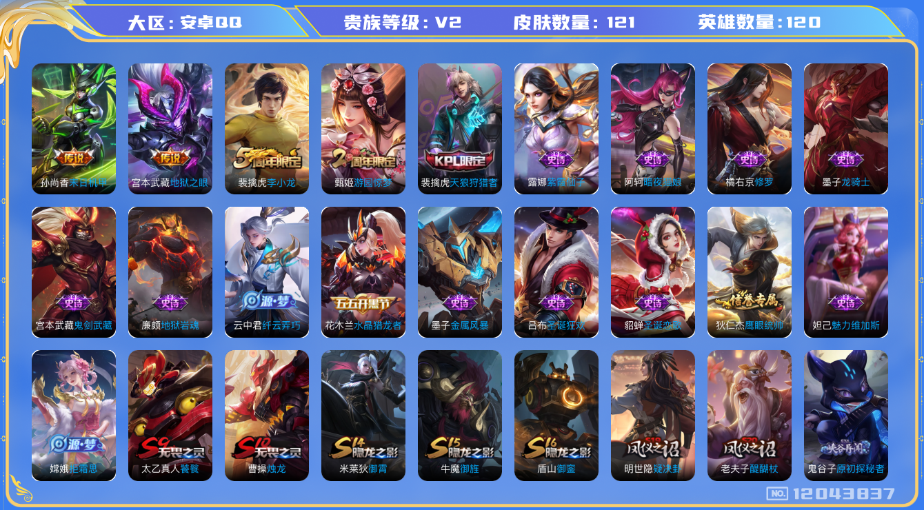 [12043837]【暑期末清货/特价急出/永久包赔】:安卓Q-V2-尊贵铂金IV段位-120英雄-121皮肤-2传说-22史诗