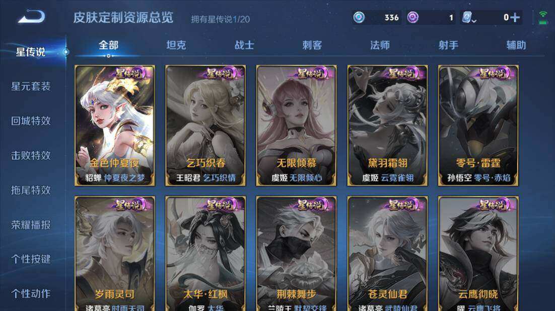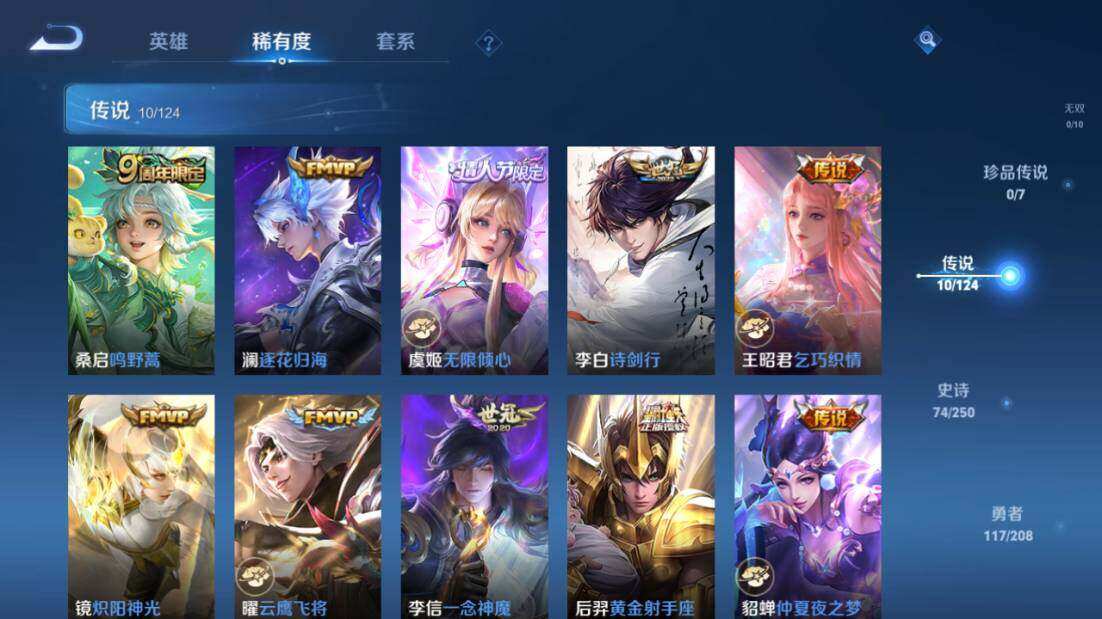 【传说皮肤】:桑启鸣野蒿,澜逐花归海,虞姬无限倾心,李白诗剑行,王昭君乞巧织情,镜炽阳神光,曜云鹰飞将,李信一念神魔,后羿黄金射手座,貂蝉仲夏夜之梦