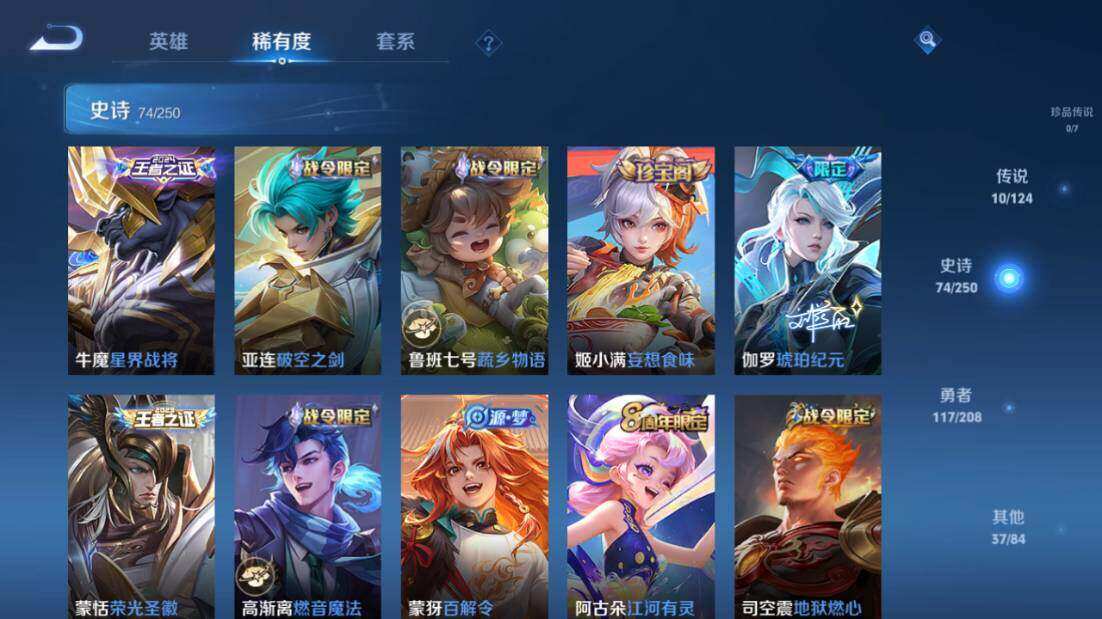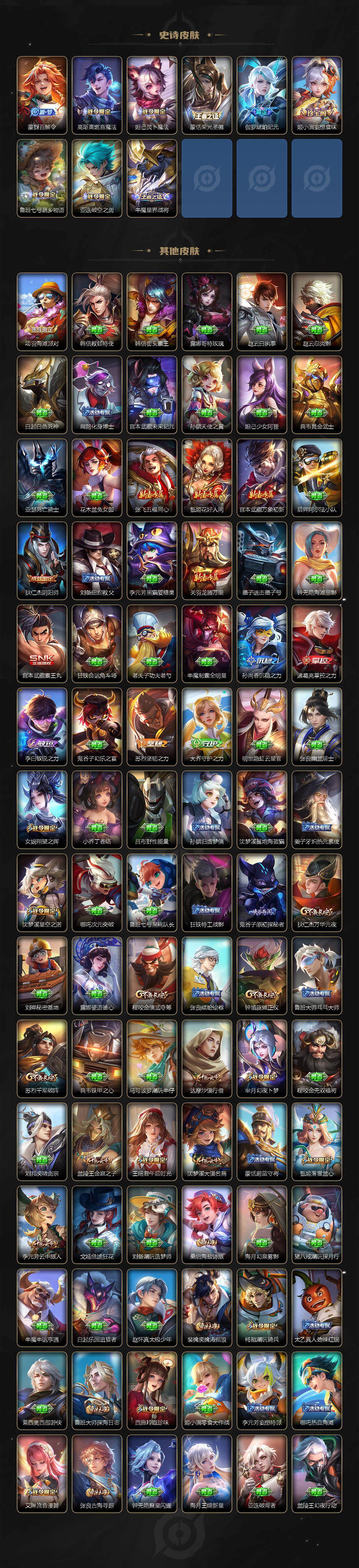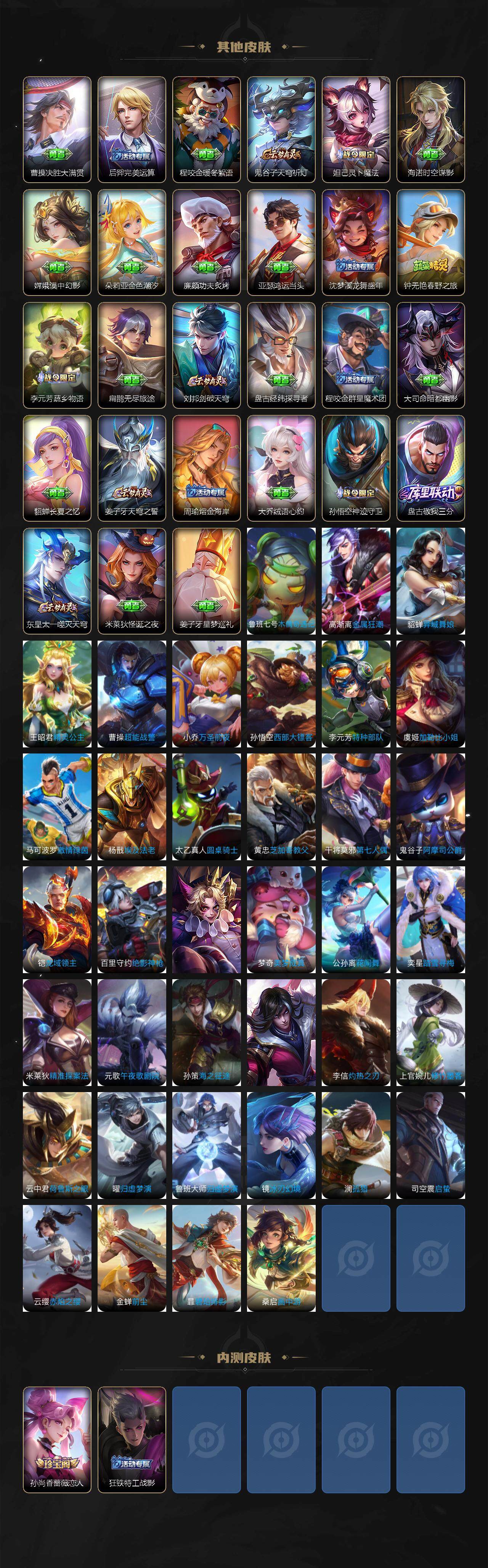【限定皮肤】:大乔绒语心约,姜子牙天穹之誓,狄仁杰阴阳师,赵云皇家上将,孙尚香蔷薇恋人,庄周高山流水,钟无艳超时空战士,扁鹊奇幻香踪,芈月幻夜卜梦,元歌无心,甄姬落雪兰心,马可波罗山海玄木吟,狄仁杰魔术师,狄仁杰万华元夜,达摩沙漠行僧,项羽海滩派对,老夫子航海奇遇记,关羽百相守梦,程咬金演武夺筹,露娜一生所爱,韩信飞衡,王昭君午后时光,兰陵王金庭之子,孙悟空至尊宝,孙悟空孙行者,后羿如梦令,李元芳匿光侦查者,李元芳云中旅人,虞姬无限倾心,钟馗驱傩正仪,杨戬潮玩骑兵,女娲朔望之晖,鬼谷子原初探秘者,鬼谷子五谷丰年,黄忠火炮绅士,苏烈千军破阵,百里玄策原初追逐者,梦奇顽趣,公孙离玉兔公主,沈梦溪星空之诺,沈梦溪大漠名商,裴擒虎李小龙,裴擒虎擒涛扼浪,狂铁电玩高手,云中君纤云弄巧,上官婉儿梁祝,嫦娥拒霜思,西施玲珑珍味,鲁班大师探海日志,桑启海盐诗旅,戈娅驭风魔法,艾琳流音漫舞,司空震地狱燃心,阿古朵江河有灵,张良古海寻踪,蒙犽百解令,蒙恬荣光圣徽,高渐离燃音魔法,妲己灵卜魔法,鬼谷子天穹祈灯,伽罗琥珀纪元,姬小满妄想食味,沈梦溪龙舞盛年,鲁班七号蔬乡物语,李元芳蔬乡物语,刘邦剑破天穹,程咬金群星魔术团,周瑜熔金海岸