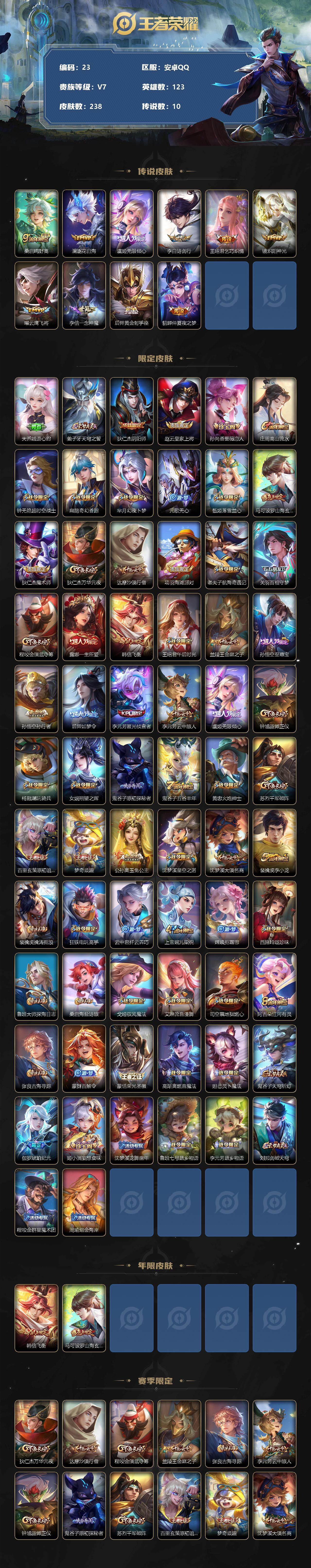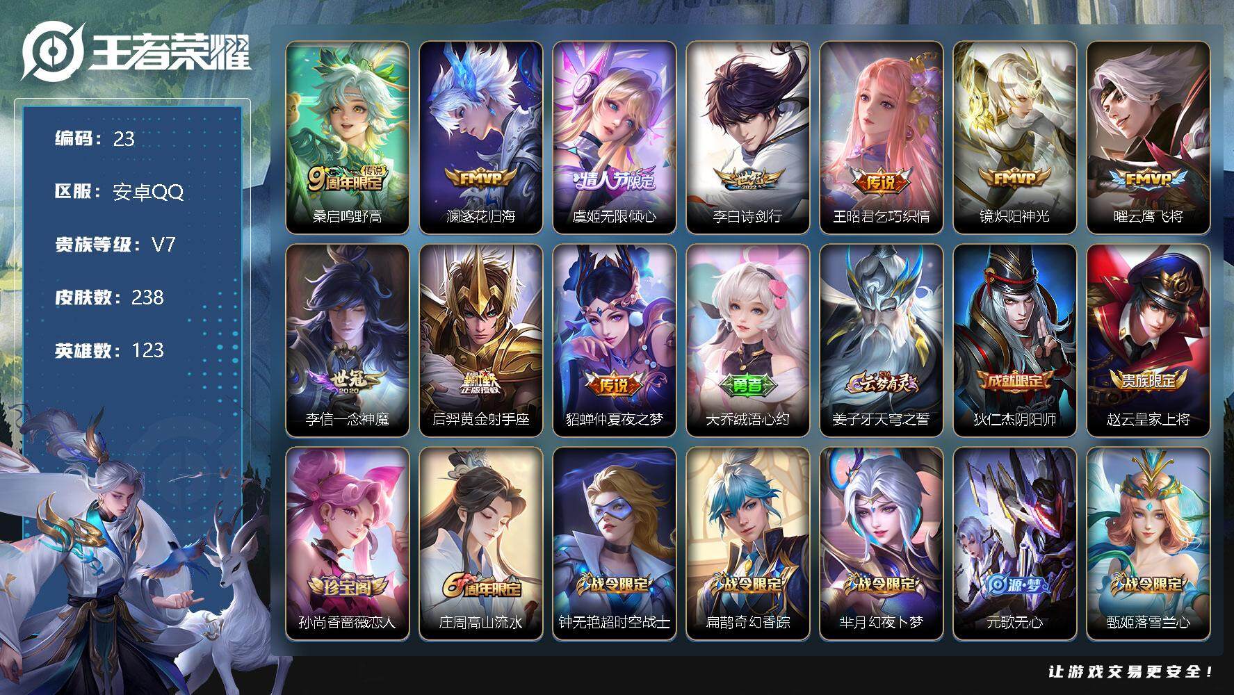 [12151411]【商品标题】:安卓Q-V7-尊贵铂金III段位-123英雄-238皮肤-0典藏-0珍品无双-0无双-0珍品传说-10传说-74史诗