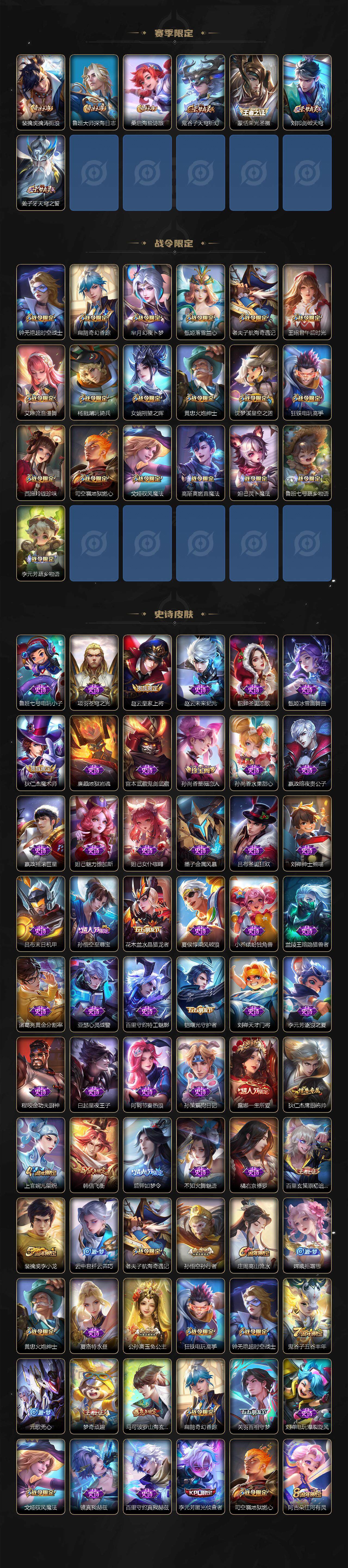 【赛季限定】:狄仁杰万华元夜,达摩沙漠行僧,程咬金演武夺筹,兰陵王金庭之子,张良古海寻踪,李元芳云中旅人,钟馗驱傩正仪,鬼谷子原初探秘者,苏烈千军破阵,百里玄策原初追逐者,梦奇顽趣,沈梦溪大漠名商,裴擒虎擒涛扼浪,鲁班大师探海日志,桑启海盐诗旅,鬼谷子天穹祈灯,蒙恬荣光圣徽,刘邦剑破天穹,姜子牙天穹之誓