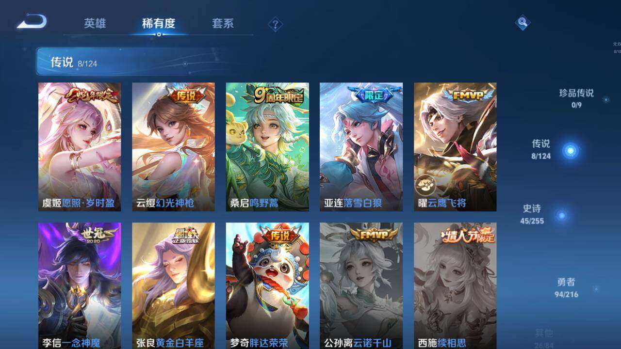 【传说皮肤】:虞姬愿照岁时盈,云缨幻光神枪,桑启鸣野蒿,亚连落雪白狼,曜云鹰飞将,李信一念神魔,张良黄金白羊座,梦奇胖达荣荣