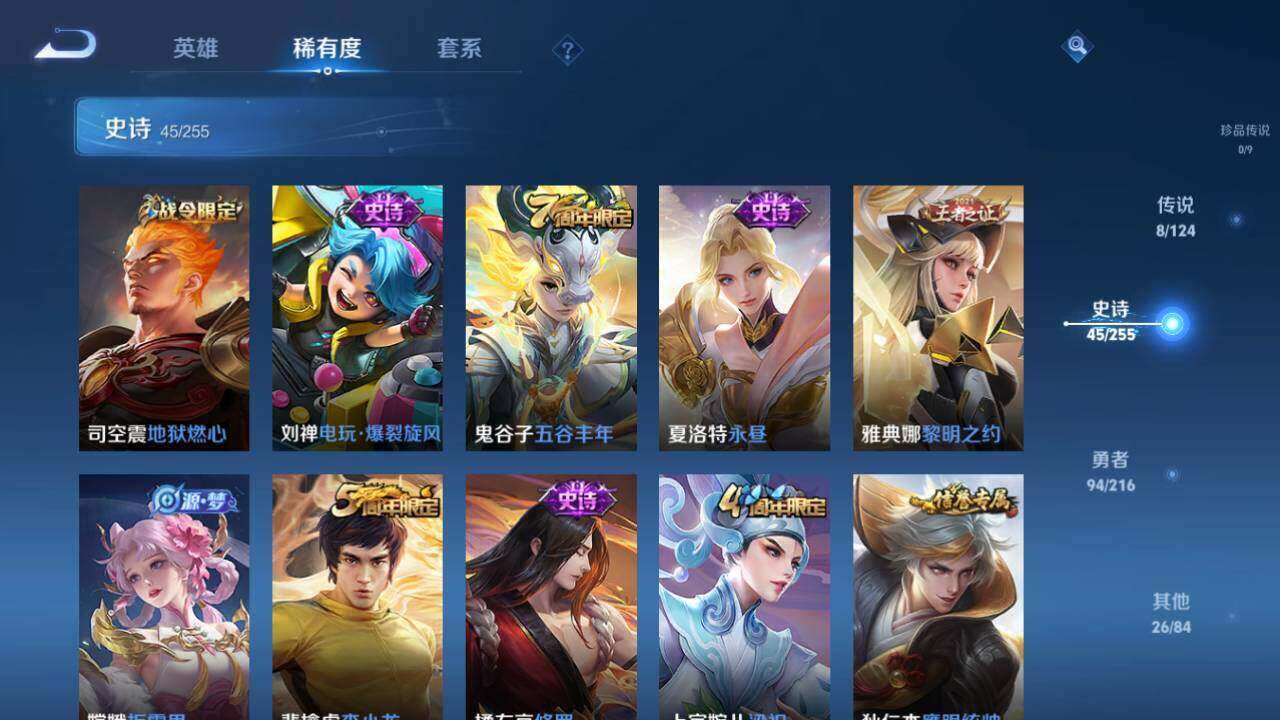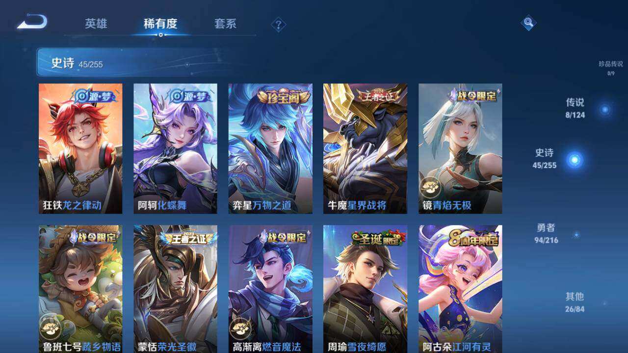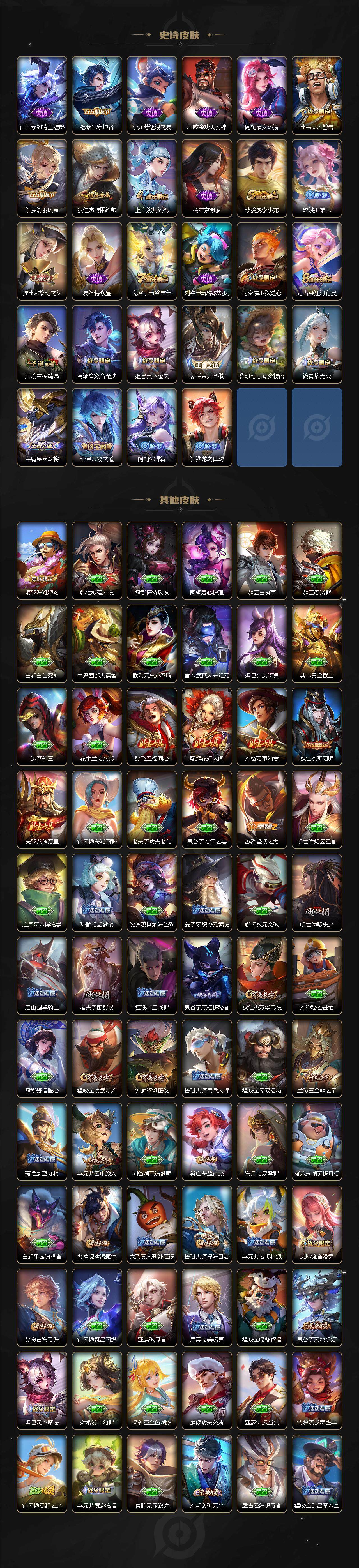 【史诗皮肤】:露娜紫霞仙子,赵云皇家上将,赵云未来纪元,貂蝉圣诞恋歌,甄姬冰雪圆舞曲,王昭君偶像歌手,狄仁杰魔术师,宫本武藏鬼剑武藏,孙尚香蔷薇恋人,孙尚香水果甜心,墨子金属风暴,吕布圣诞狂欢,刘禅绅士熊喵,李白千年之狐,张飞乱世虎臣,花木兰水晶猎龙者,兰陵王暗隐猎兽者,雅典娜冰冠公主,百里守约特工魅影,铠曙光守护者,李元芳逐浪之夏,程咬金功夫厨神,阿轲节奏热浪,典韦蓝屏警告,伽罗箭羽风息,狄仁杰鹰眼统帅,上官婉儿梁祝,橘右京修罗,裴擒虎李小龙,嫦娥拒霜思,雅典娜黎明之约,夏洛特永昼,鬼谷子五谷丰年,刘禅电玩爆裂旋风,司空震地狱燃心,阿古朵江河有灵,周瑜雪夜绮愿,妲己灵卜魔法,高渐离燃音魔法,蒙恬荣光圣徽,鲁班七号蔬乡物语,镜青焰无极,牛