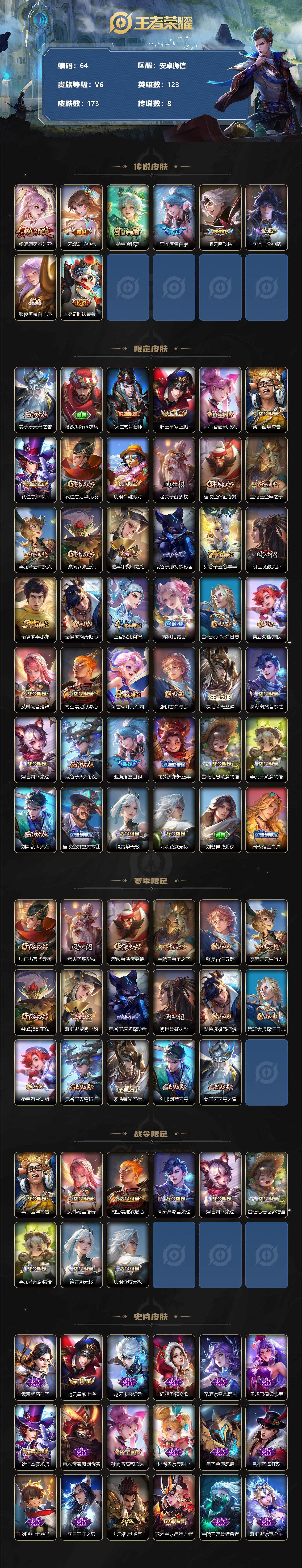 - [11657121]V8 2典藏 1无双 28传说 125英雄 341皮肤 可修改实名 优质装备:鸣剑·曳影,韩信群星魔术团(韩信无双),拾光映像(瑶典藏),云鹰飞将(小将军),绛天战甲(鸡嘴战神),猫影幻舞,久胜战神,炽阳神光,一念神魔,末日机甲-孙尚香(绿蚂蚱),地狱之眼,超时空战士-狄仁杰,花朝如约(花篮子),无双飞将,山海·炽霜斩(李信年限),炽翼辉光(娃娃菜牛角包),电玩·雷克斯,鹤归松栖(云缨),夜礼服假面,霜月吟 传说皮:乘龙·问璇玑(孙尚香年限),幻光神枪 珍宝阁皮:万物之道,优雅恋人,玩趣恶龙 限定皮:愿照·九州拓(澜年限),愿照·岁时盈(虞姬年限),愿照·山河定(司空震年限),愿照·千秋盛(女娲年限),鸣野蒿,至尊宝,补天,时雨天司(水龙头),高山流水,游园惊梦,逐梦之星,岱宗(典韦年限),奔雷神使(牛魔年限),祈雪灵祝(雪兔子),李小龙,逐梦之影,默契交锋-花木兰,孙行者,猪悟能,蜜橘之夏,玉兔公主,山海·玄木吟(马可年限) 史诗皮:器灵·浮梦炉,化蝶舞,星界战将,茶境仙,怒海争锋,战舞者,东方月初,海诺心动手记,琥珀纪元伽罗,蔬乡物语(鲁班七号),紫霞仙子,黄金分割率,特工魅影,千年之狐,江河有灵,鹤归松栖(赵怀真),雪夜绮愿(周瑜),魅语,高渐离燃音魔法,蒙恬荣光圣徽,无限星赏官,冰冠公主,偶像歌手,晚萤,电玩·爆裂旋风,暗夜猫娘,百相守梦(关羽),末日机甲-吕布,猫狗日记-孙策,猫狗日记-大乔,乱世虎臣,节奏热浪,修罗,女仆咖啡,水果甜心,绅士熊喵,天才门将,星夜王子,心灵骇客,德古拉伯爵,暗隐猎兽者,幽灵船长,鬼剑武藏,暗渊魔法,心灵战警,乐园奇幻夜,地狱岩魂,纤云弄巧,拒霜思,缤纷独角兽,乘风破浪,逐浪之夏,月团寄思,水晶猎龙者,曙光守护者,箭羽风息,金属风暴,原初追逐者,圣诞狂欢,圣诞恋歌,鹰眼统帅,魅力维加斯,黎明之约,赏金猎手,未来纪元-赵云,玫瑰异探