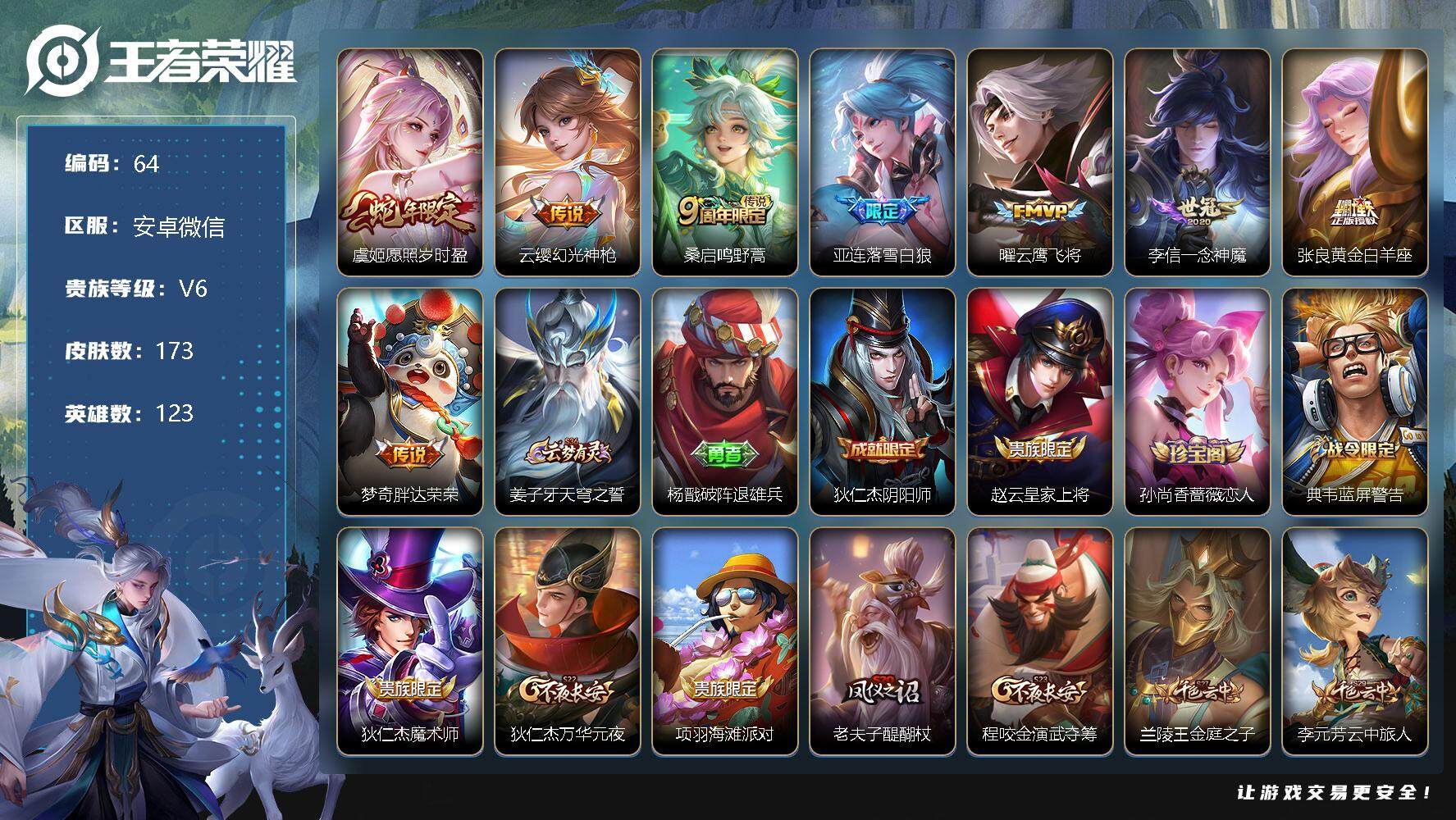 [12151596]【商品标题】:AK597-安卓WX-V6-永恒钻石II段位-123英雄-173皮肤-1典藏(水晶未兑换)-0珍品无双-0无双-0珍品传说-8传说-45史诗 【传说皮肤】:虞姬愿照岁时盈,云缨幻光神枪,桑启鸣野蒿,亚连落雪白狼,曜云鹰飞将,李信一念神魔,张良黄金白羊座,梦奇胖达荣荣 【限定皮肤】:姜子牙天穹之誓,杨戬破阵退雄兵,狄仁杰阴阳师,赵云皇家上将,孙尚香蔷薇恋人,典韦蓝屏警告,狄仁杰魔术师,狄仁杰万华元夜,项羽海滩派对,老夫子醍醐杖,程咬金演武夺筹,兰陵王金庭之子,李元芳云中旅人,钟馗驱傩正仪,雅典娜黎明之约,鬼谷子原初探秘者,鬼谷子五谷丰年,明世隐疑决卦,裴擒虎李小龙,裴擒虎擒涛扼浪,上官婉儿梁祝,嫦娥拒霜思,鲁班大师探海日志,桑启海盐诗旅,艾琳流音漫舞,司空震地狱燃心,阿古朵江河有灵,张良古海寻踪,蒙恬荣光圣徽,高渐离燃音魔法,妲己灵卜魔法,鬼谷子天穹祈灯,亚连落雪白狼,沈梦溪龙舞盛年,鲁班七号蔬乡物语,李元芳蔬乡物语,刘邦剑破天穹,程咬金群星魔术团,镜青焰无极,项羽苍威无极,刘备异域游侠,周瑜熔金海岸 【赛季限定】:狄仁杰万华元夜,老夫子醍醐杖,程咬金演武夺筹,兰陵王金庭之子,张良古海寻踪,李元芳云中旅人,钟馗驱傩正仪,雅典娜黎明之约,鬼谷子原初探秘者,明世隐疑决卦,裴擒虎擒涛扼浪,鲁班大师探海日志,桑启海盐诗旅,鬼谷子天穹祈灯,蒙恬荣光圣徽,刘邦剑破天穹,姜子牙天穹之誓 【战令限定】:典韦蓝屏警告,艾琳流音漫舞,司空震地狱燃心,高渐离燃音魔法,妲己灵卜魔法,鲁班七号蔬乡物语,李元芳蔬乡物语,镜青焰无极,项羽苍威无极 【史诗皮肤】:露娜紫霞仙子,赵云皇家上将,赵云未来纪元,貂蝉圣诞恋歌,甄姬冰雪圆舞曲,王昭君偶像歌手,狄仁杰魔术师,宫本武藏鬼剑武藏,孙尚香蔷薇恋人,孙尚香水果甜心,墨子金属风暴,吕布圣诞狂欢,刘禅绅士熊喵,李白千年之狐,张飞乱世虎臣,花木兰水晶猎龙者,兰陵王暗隐猎兽者,雅典娜冰冠公主,百里守约特工魅影,铠曙光守护者,李元芳逐浪之夏,程咬金功夫厨神,阿轲节奏热浪,典韦蓝屏警告,伽罗箭羽风息,狄仁杰鹰眼统帅,上官婉儿梁祝,橘右京修罗,裴擒虎李小龙,嫦娥拒霜思,雅典娜黎明之约,夏洛特永昼,鬼谷子五谷丰年,刘禅电玩爆裂旋风,司空震地狱燃心,阿古朵江河有灵,周瑜雪夜绮愿,妲己灵卜魔法,高渐离燃音魔法,蒙恬荣光圣徽,鲁班七号蔬乡物语,镜青焰无极,牛